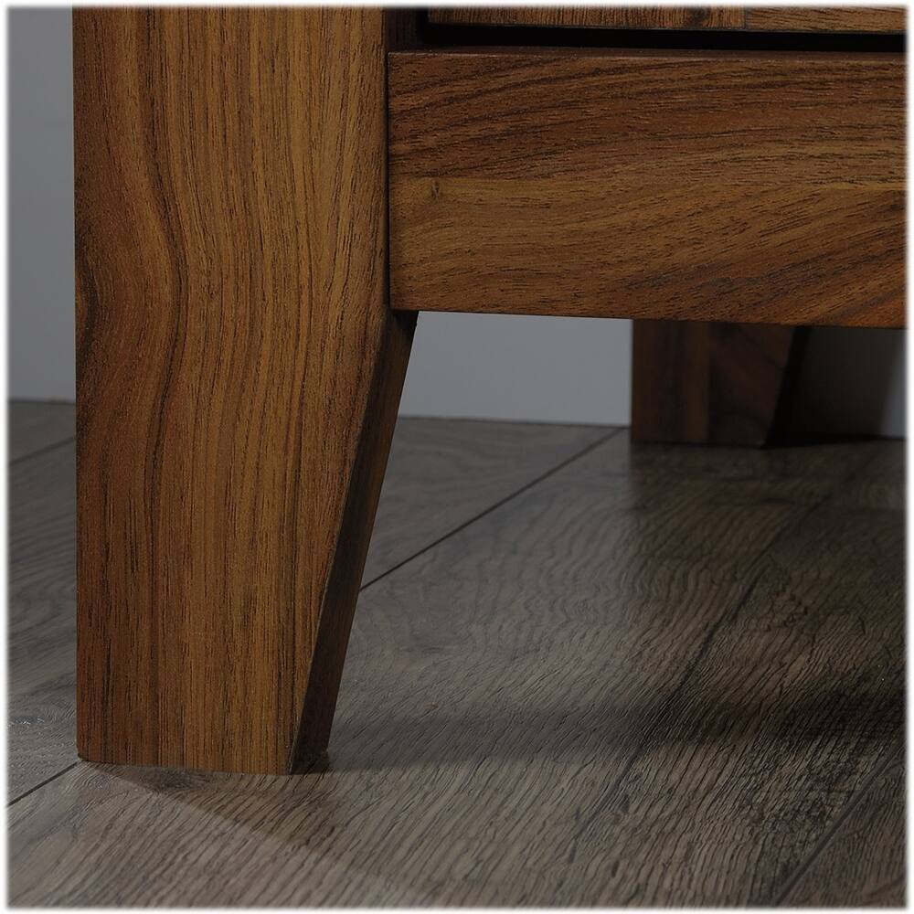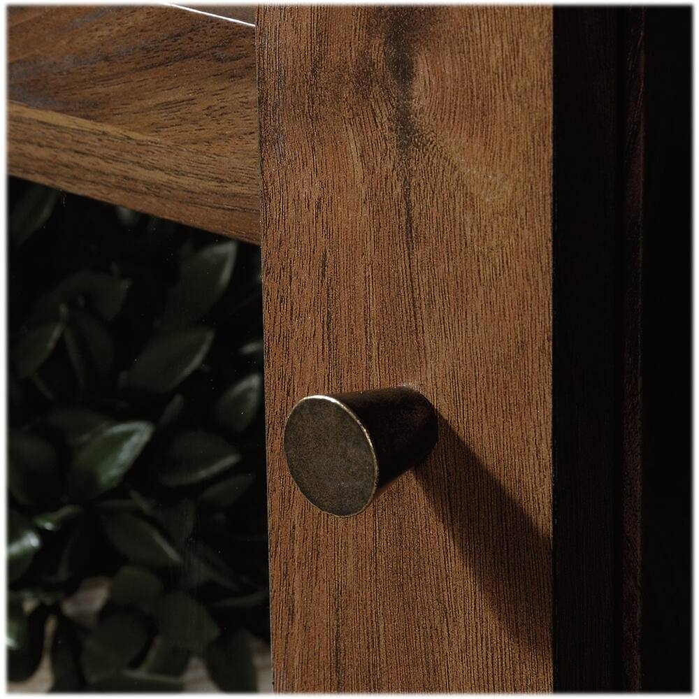 - A:Answer This entertainment credenza has an adjustable shelf located behind each of its framed glass doors.
