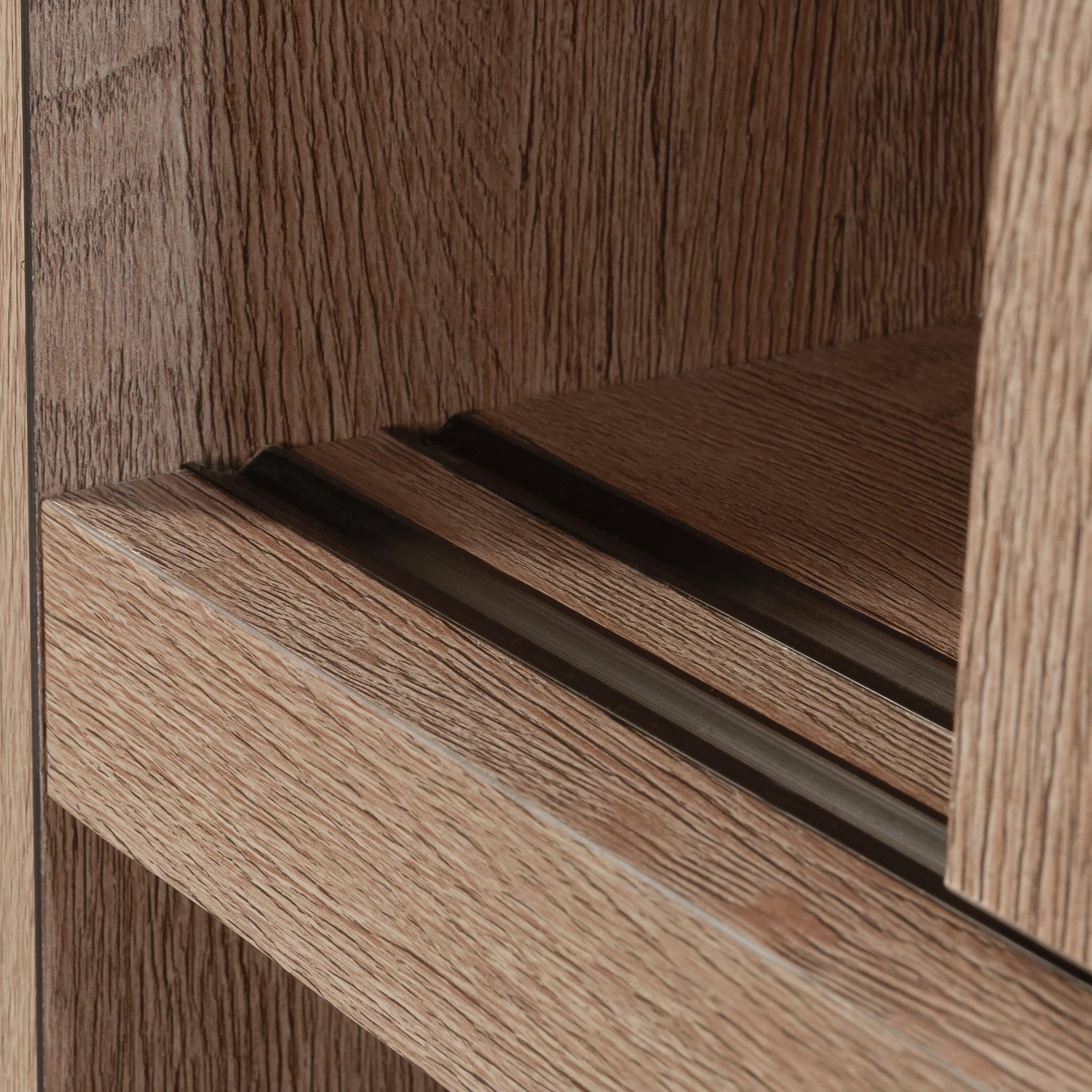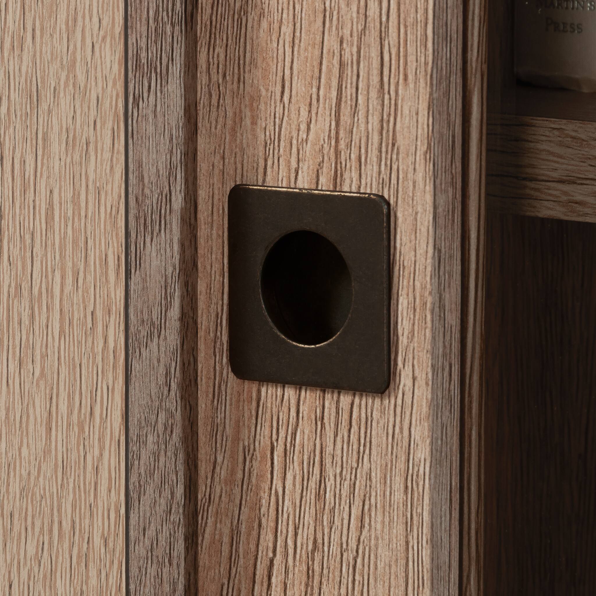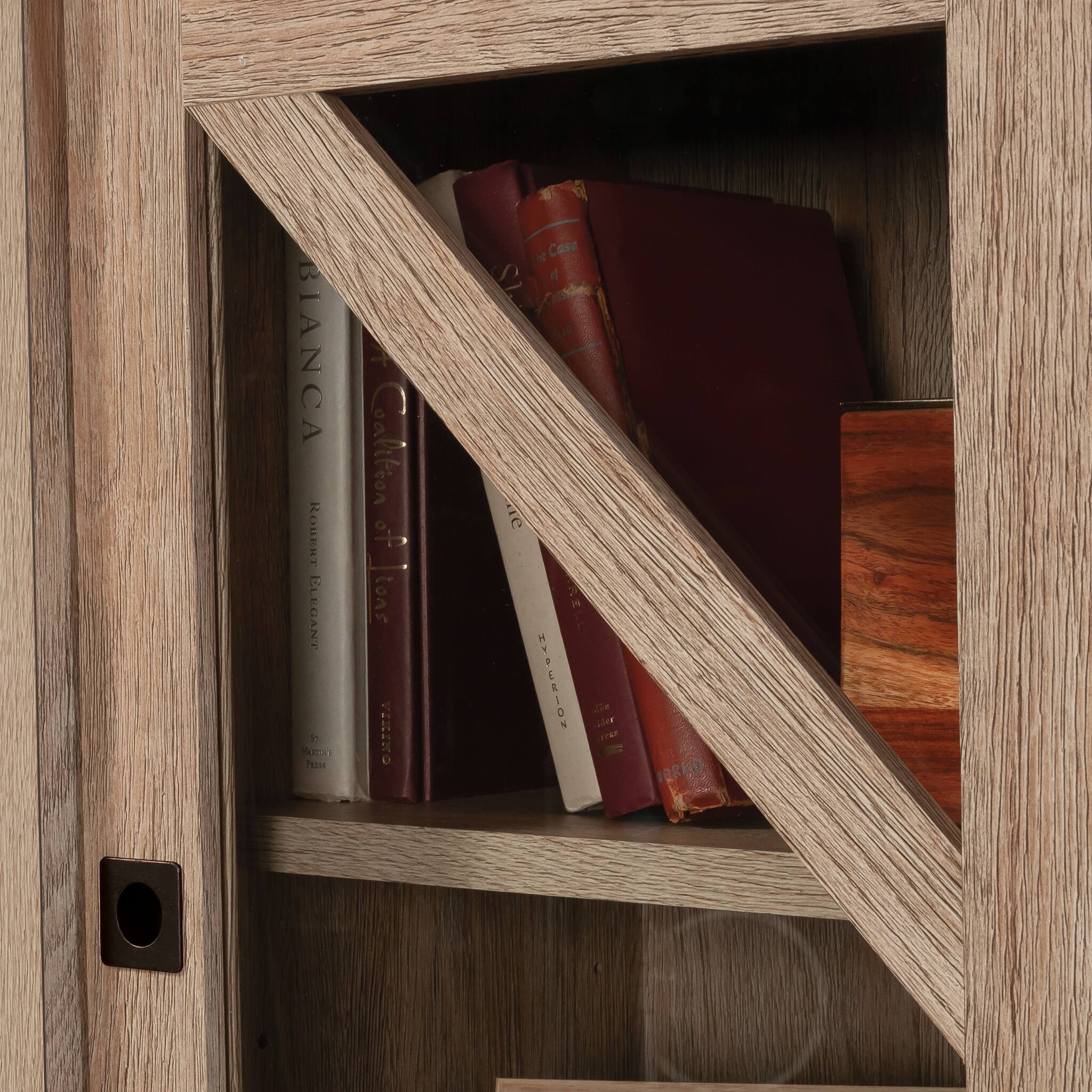 - A:Answer The sliding doors on this hutch are made of safety-tempered glass and accented with a diagonal trestle.