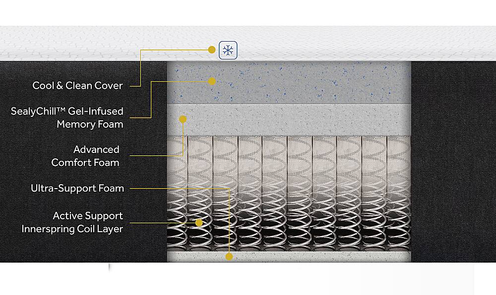 - A:Answer The hybrid construction of the Sealy COOL & CLEAN 14" HYBRID mattress combines the benefits of innerspring coils and memory foam by providing responsive support from the Quantum Edge fabric-encased coils and body-conforming comfort from the SealyChill Gel-Infused Memory Foam and Advanced Comfort Foam layers. This combination helps reduce tossing and turning, promoting a more restful sleep.