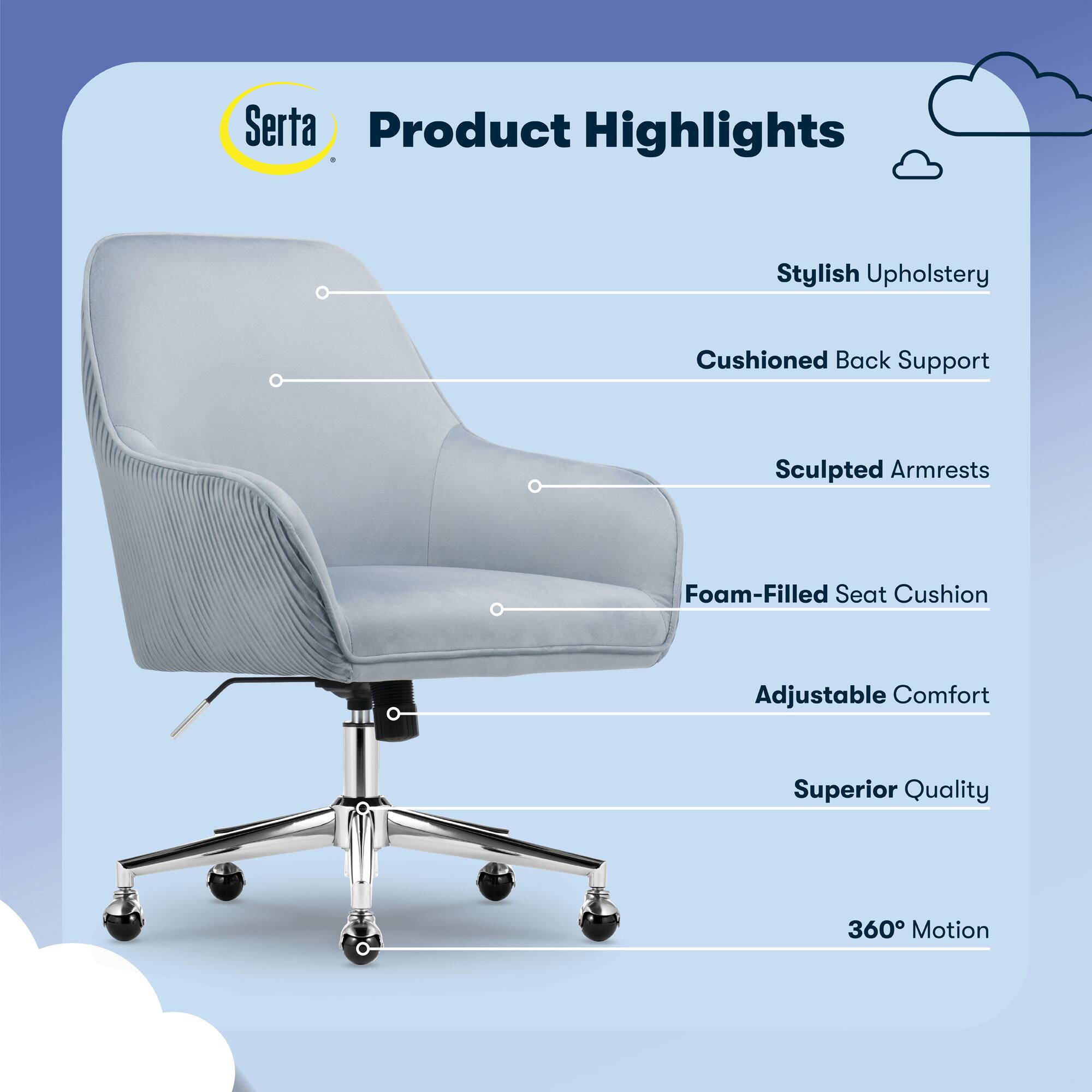 - A:Answer Assembly is required for the Serta Chloe Soft Velvet Modern Home Office Chair.
