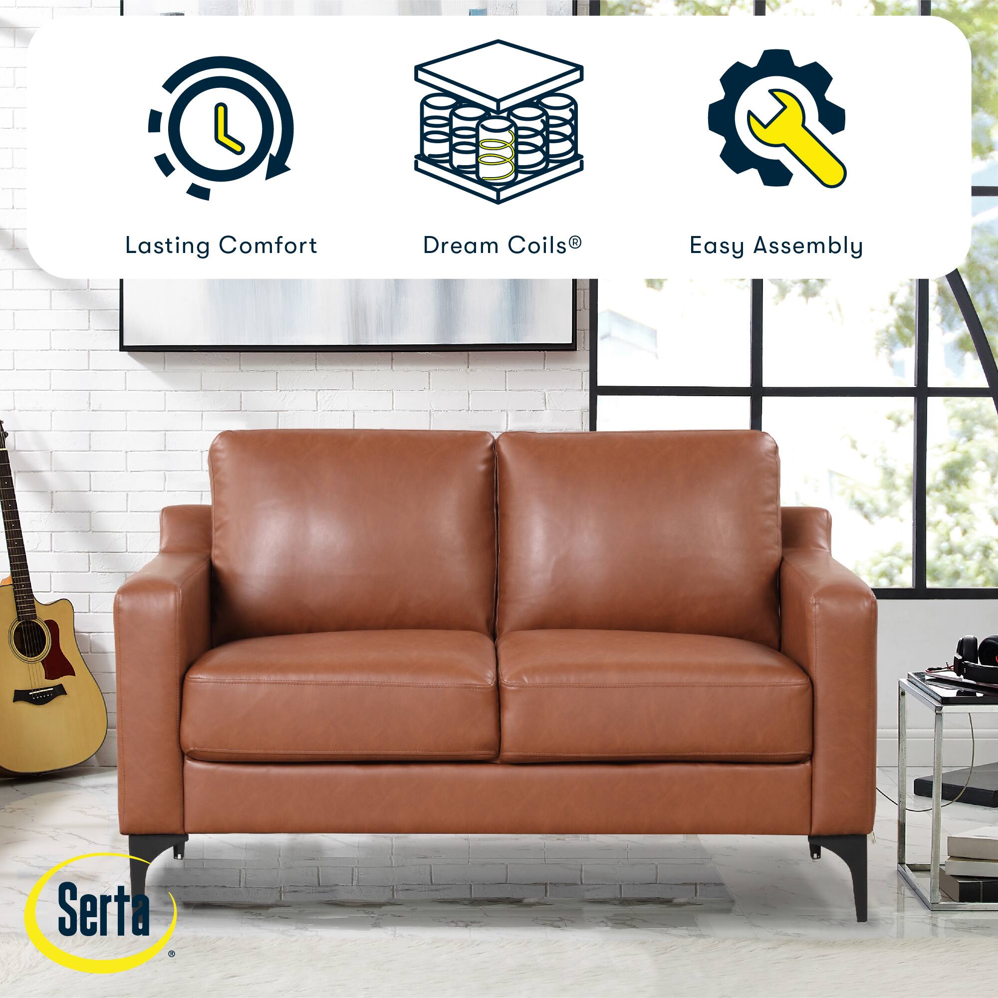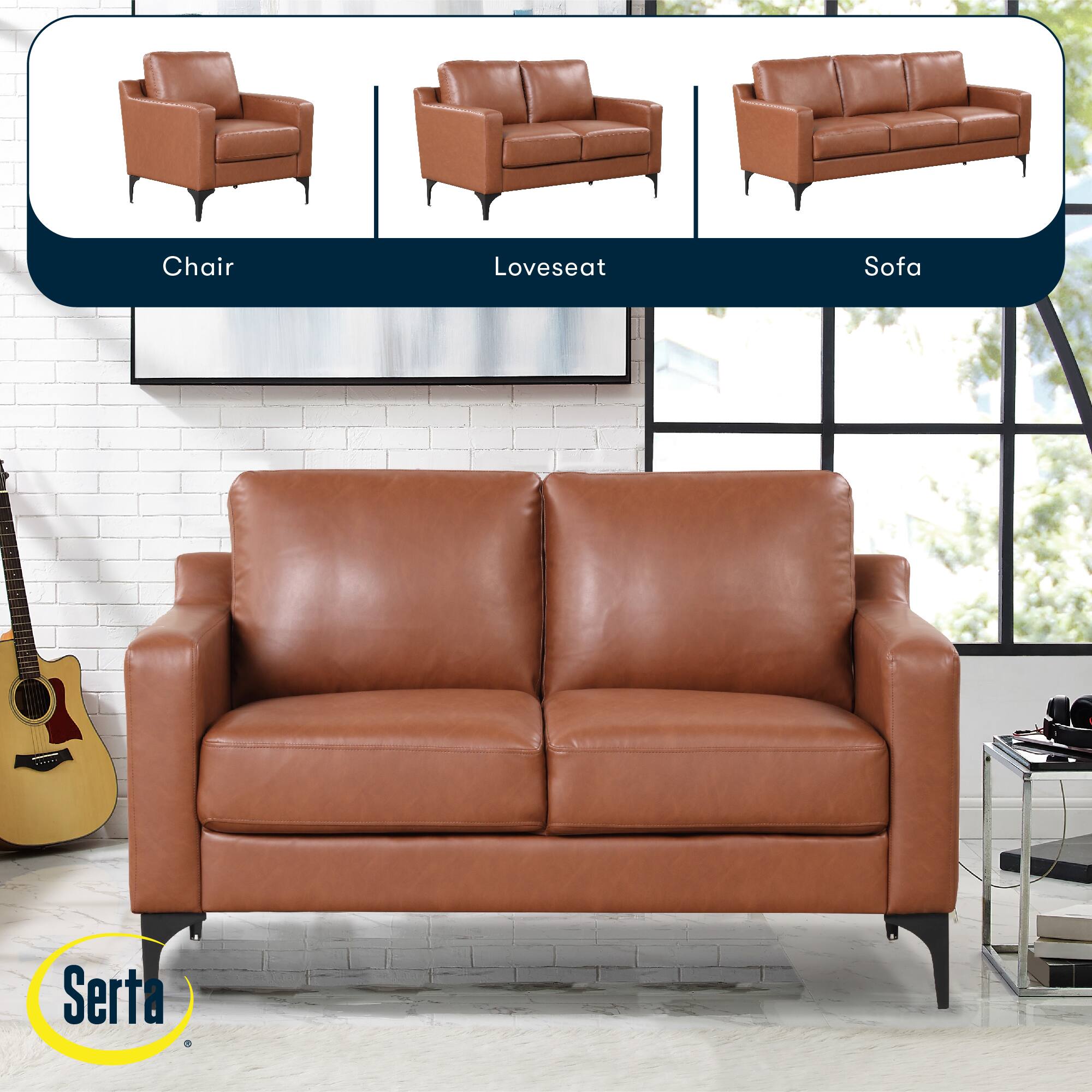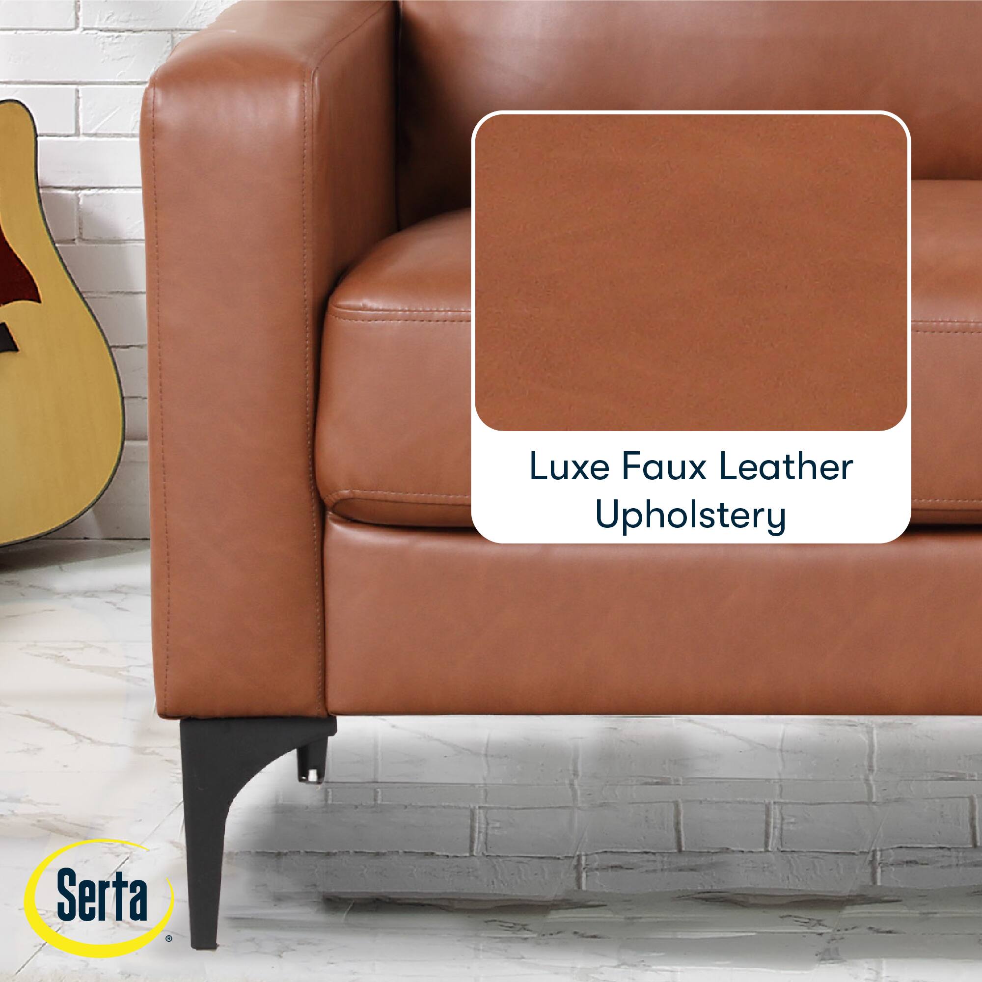 - A:Answer This loveseat is upholstered in a vegan leather that has stain-resistant qualities.