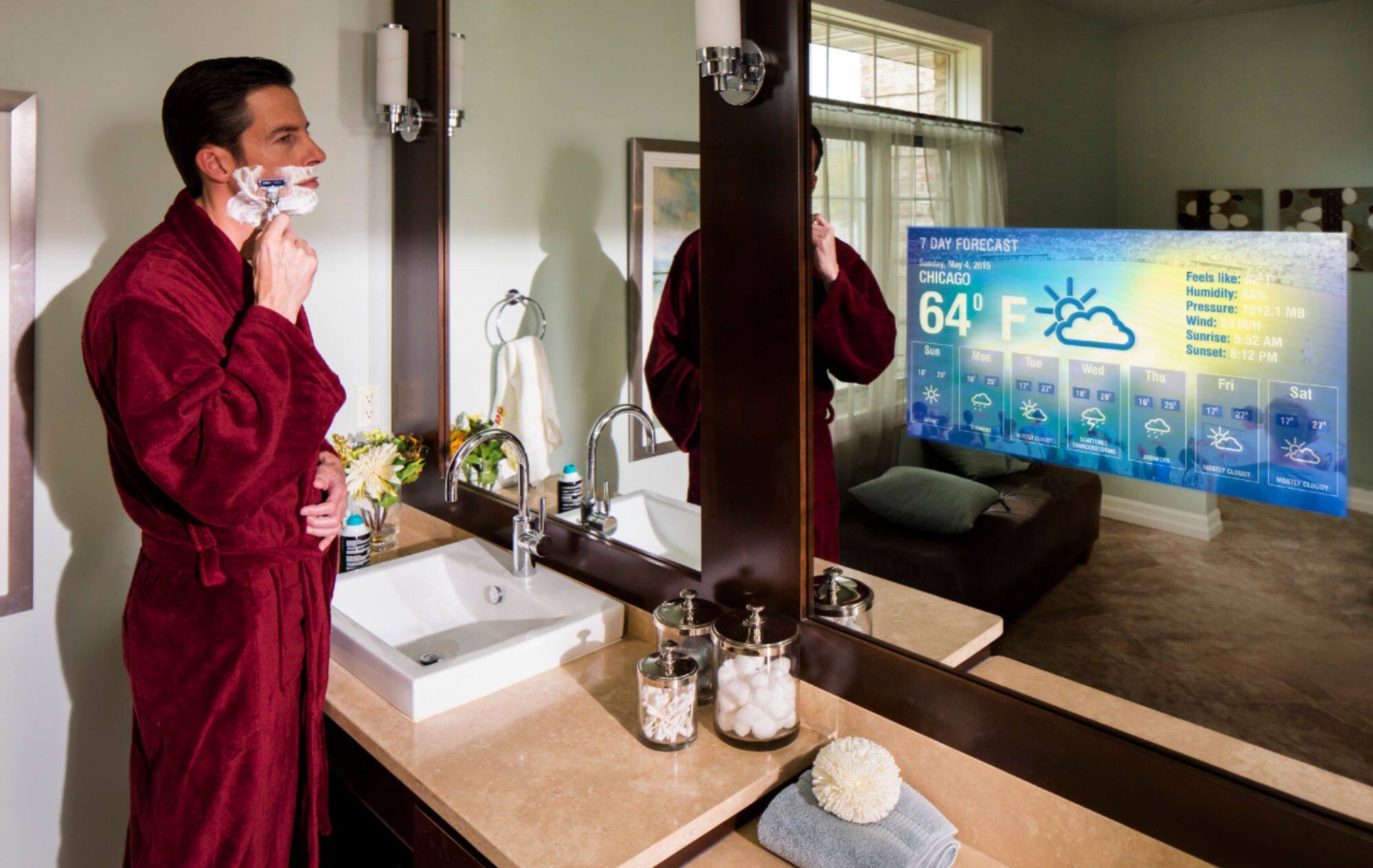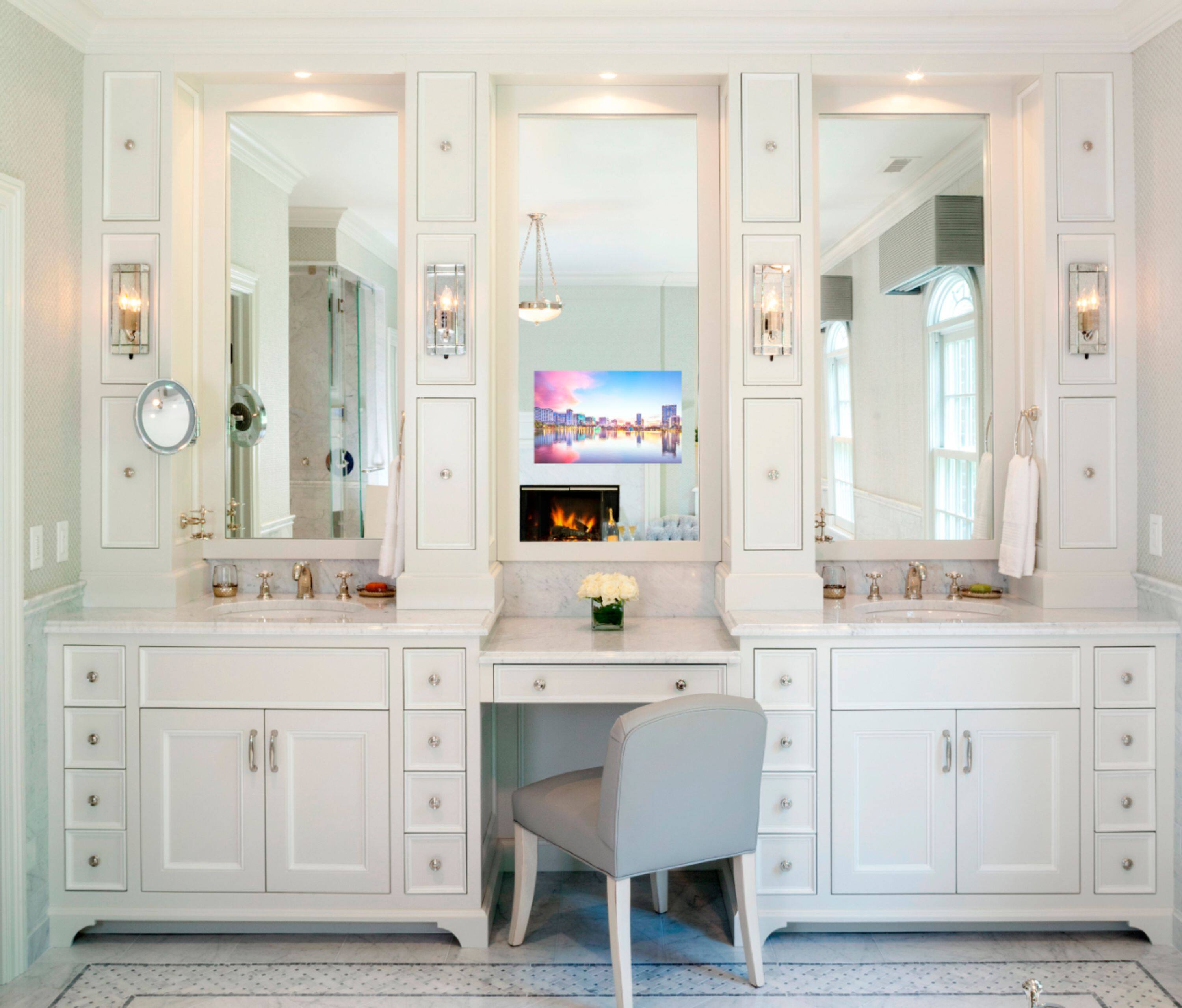 - A:Answer The S ura Vanity TV Mirror is ideal for bathrooms, dressing rooms, and spas because it seamlessly incorporates videointo these spaces. The mirror's vanishing glass technology allows for a clear TV picture when turned on, and no trace ofthe TV when turned off. This makes it a perfect solution for spaces where you want to enjoy both the functionality of aTV and the elegance of a mirror.