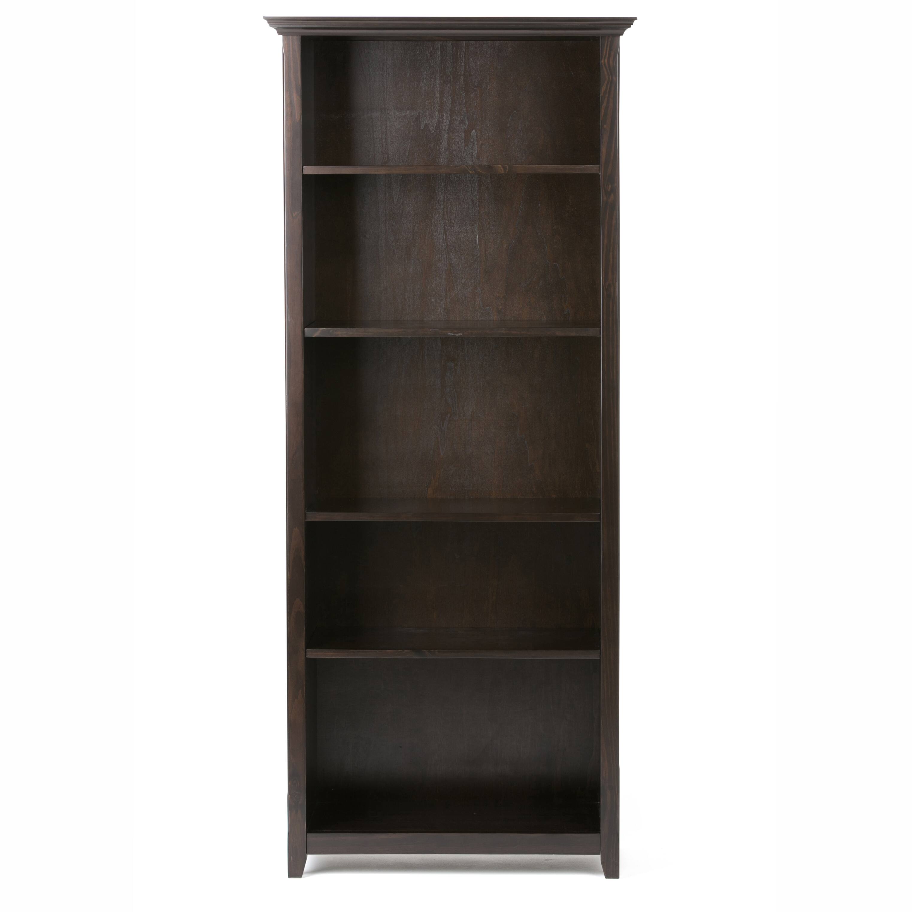 - A:Answer "Dear customer, Thank you for inquiring about our Simpli Home Amherst 5 Shelf Bookcase. We would like to inform you that this Bookcase is 30 Inches Wide. Please feel free to write us if further information about this product is needed. Thanks again."