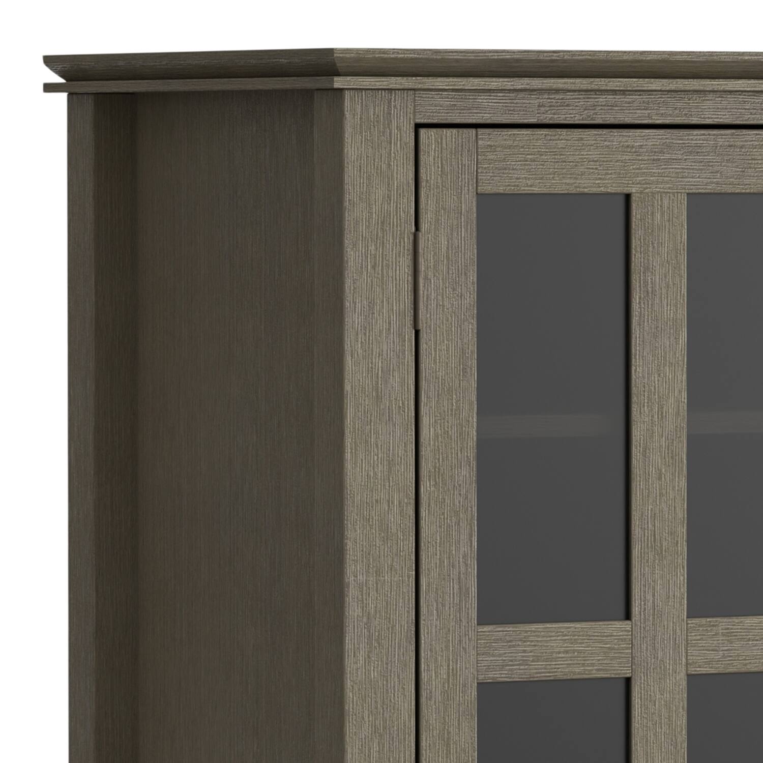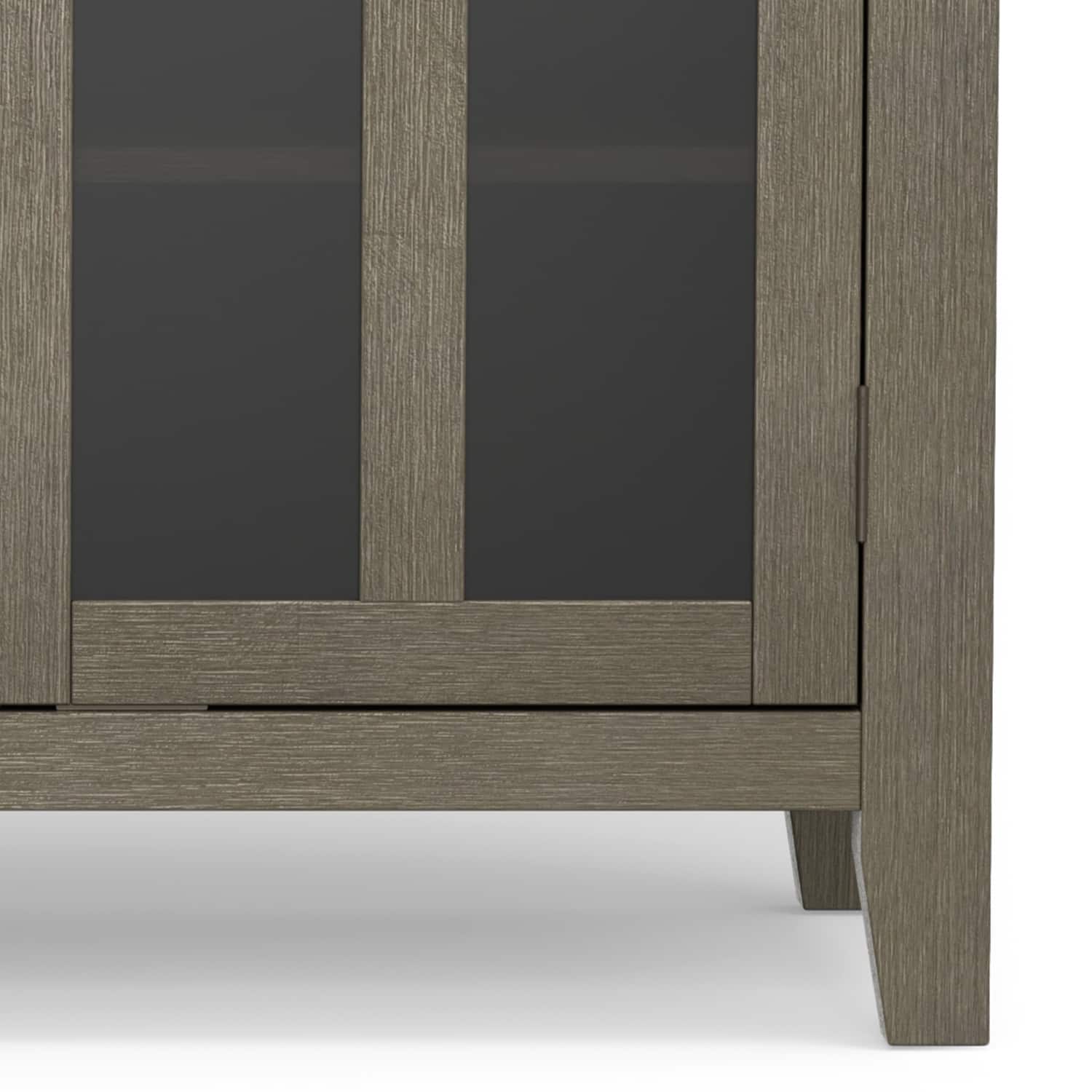 - A:Answer Dear customer, thank you for inquiring about our Simpli Home Artisan Tall TV Media Stand. We would like to inform you that the dimensions of this product are Height- 34.7 inches, Width- 53 inches, and Depth- 16.5 inches. Also, there are various shelf support anti-tipping holes, on which you can adjust the shelves behind the door as per your preference. Please feel free to write us if further information about this product is needed. Thanks, Simpli Home.