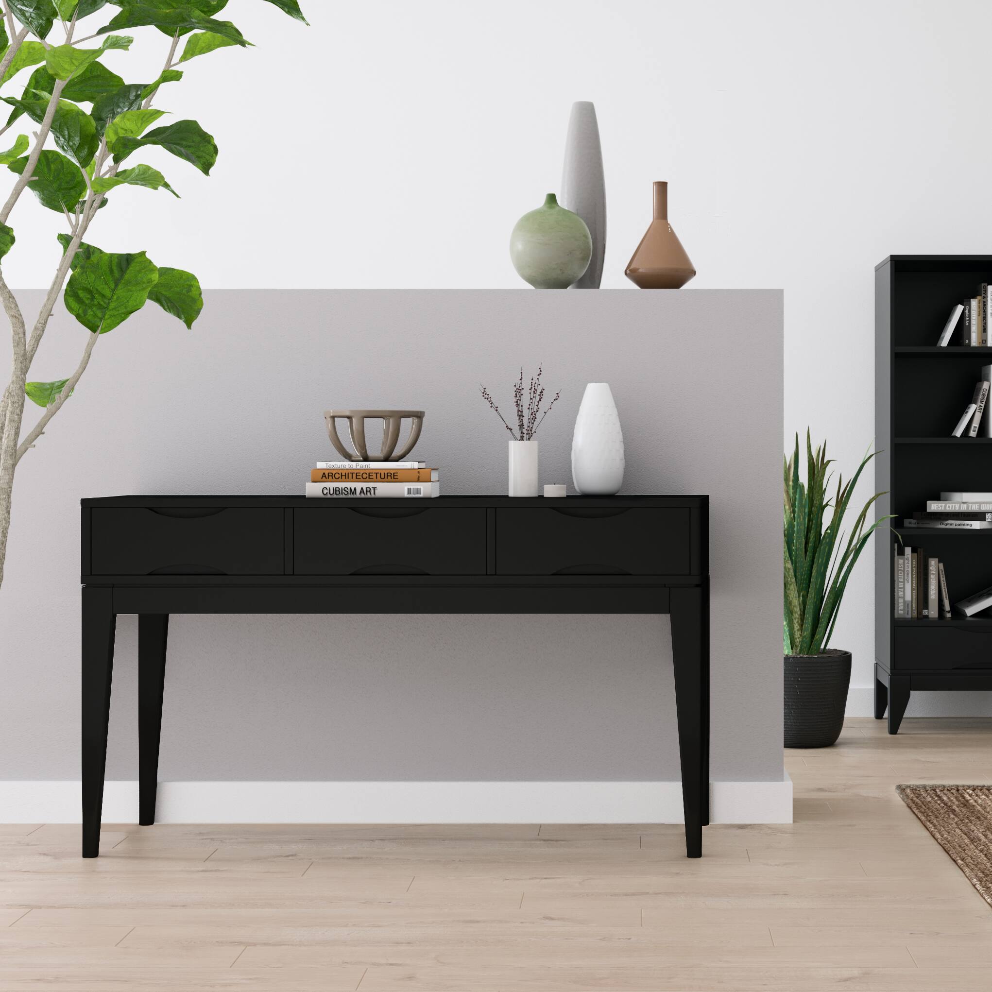 - A:Answer This stylish console table has three drawers.