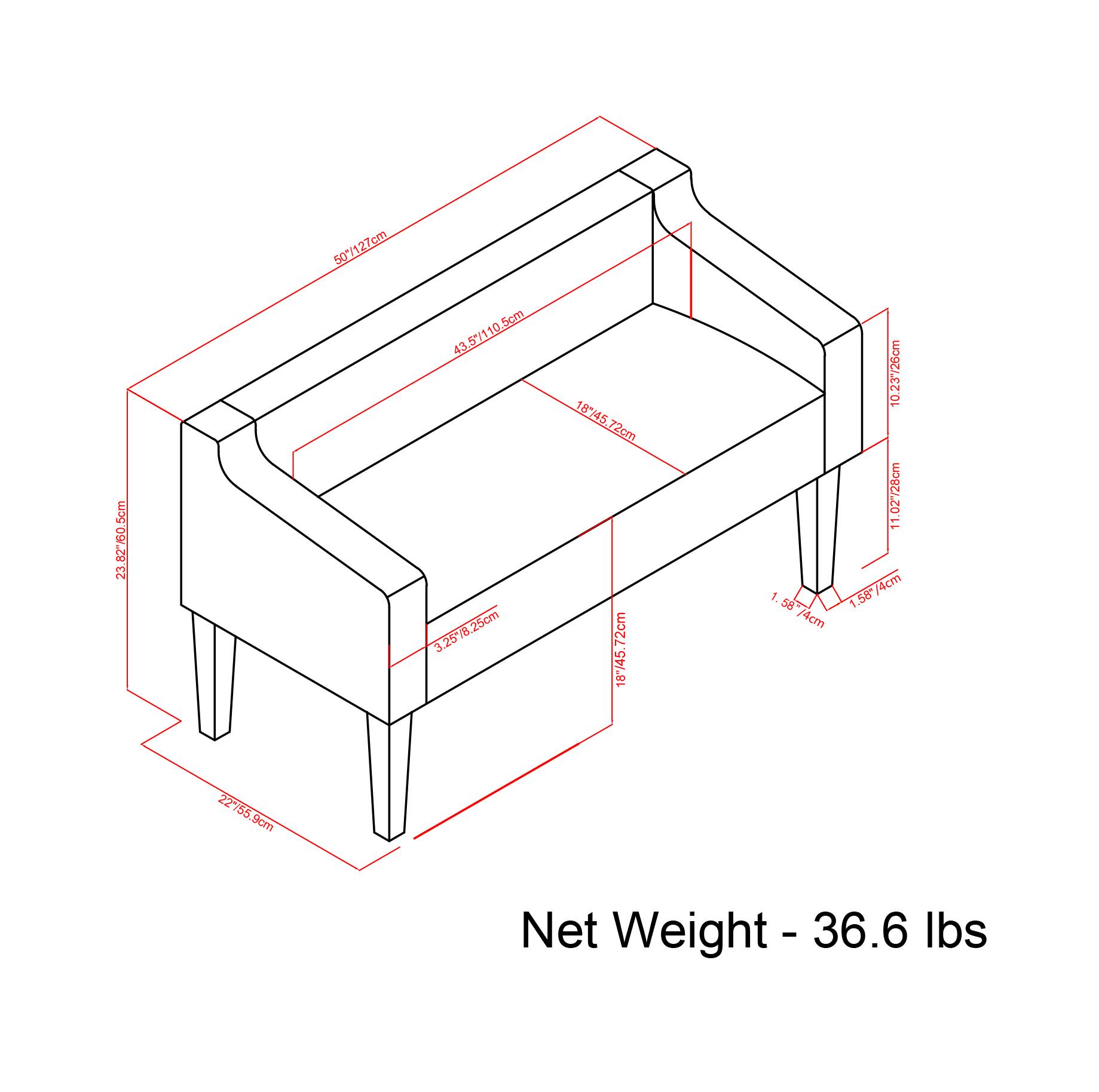 - A:Answer The Parris Upholstered Bench is 50 inches wide, 22 inches deep, and 23.8 inches high.