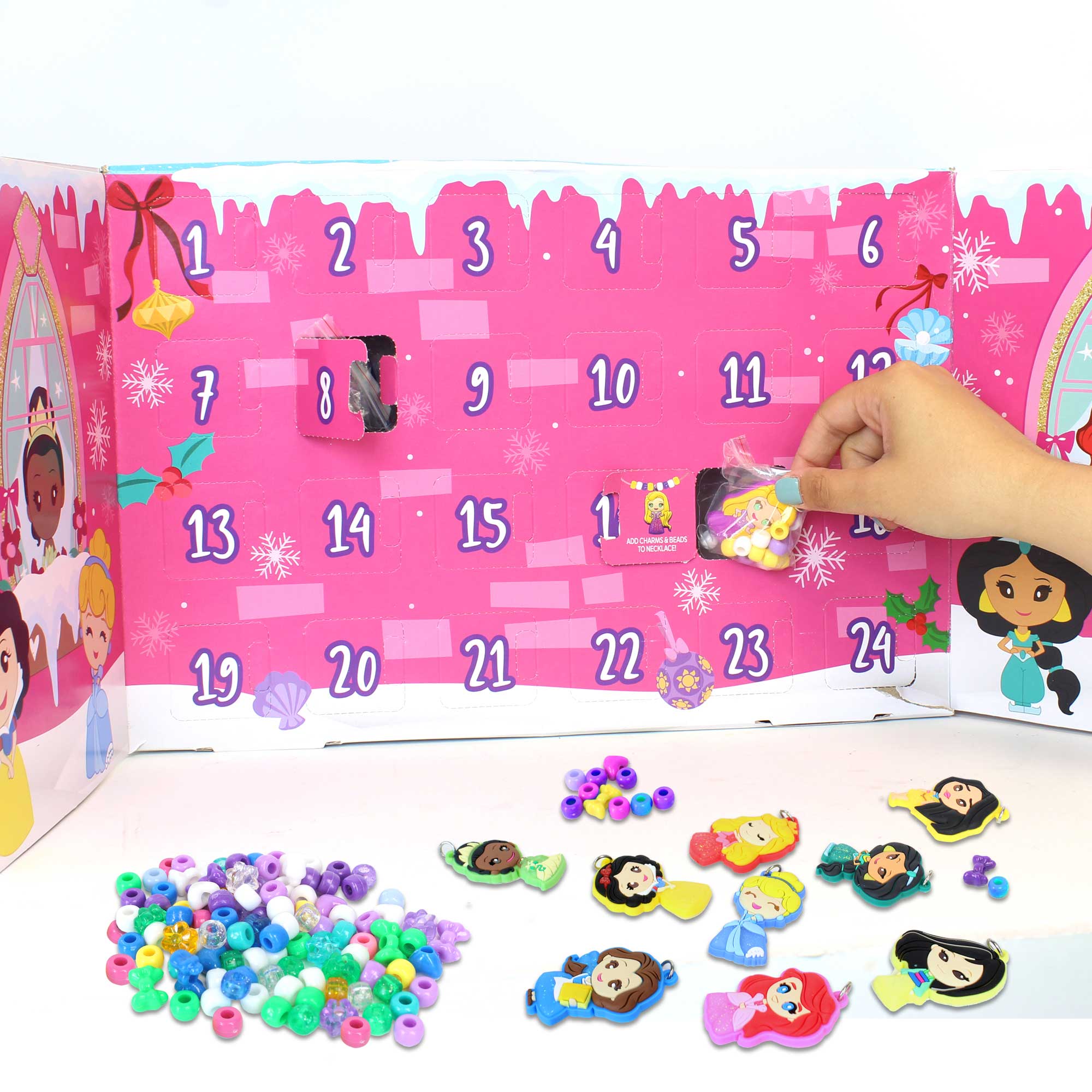 - A:Answer This jewelry advent calendar includes charms, beads, necklace cords, bracelet cords, and rings. You can use these pieces to make necklaces, bracelets, and rings.