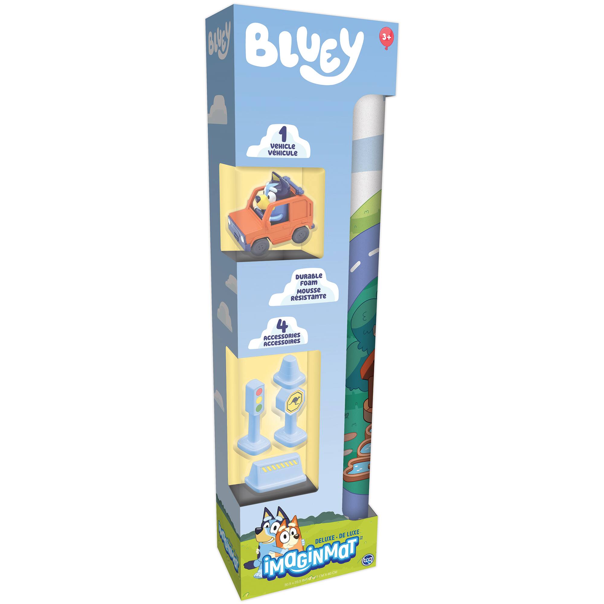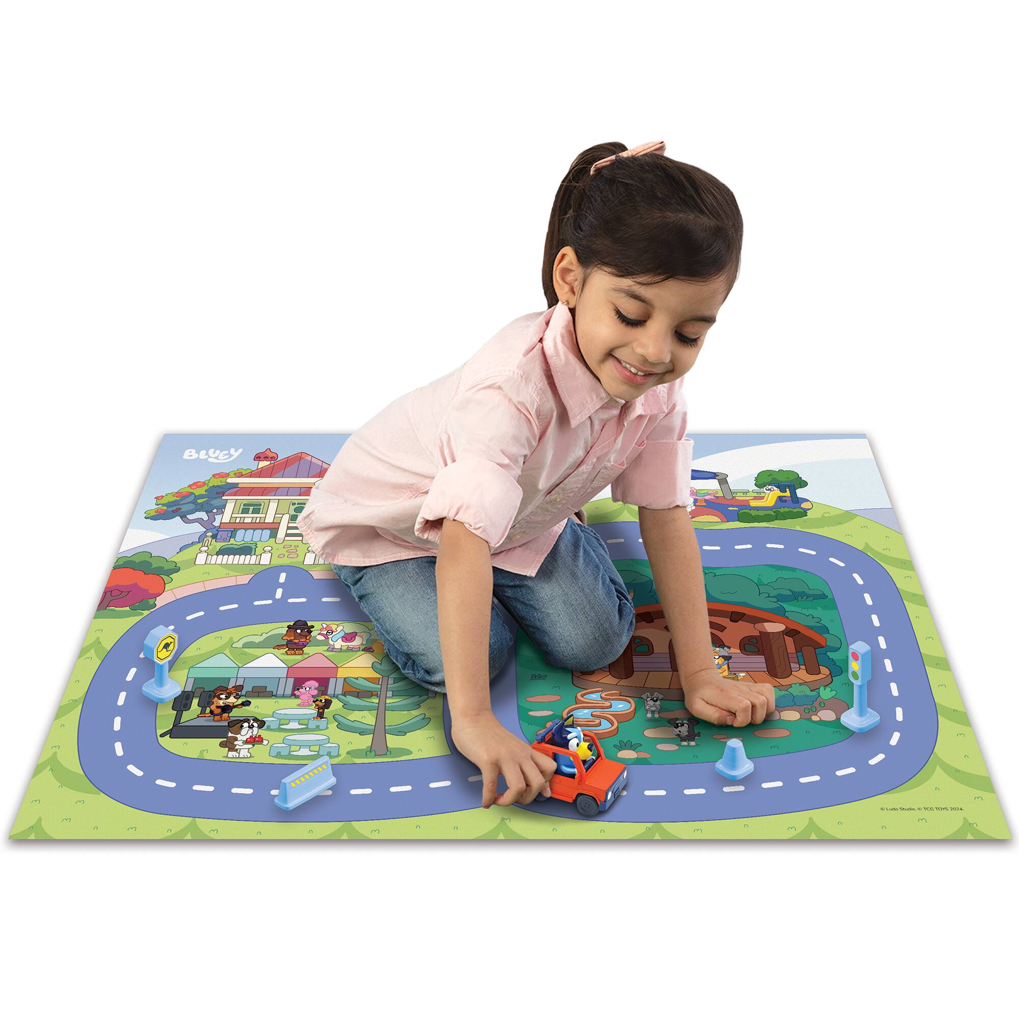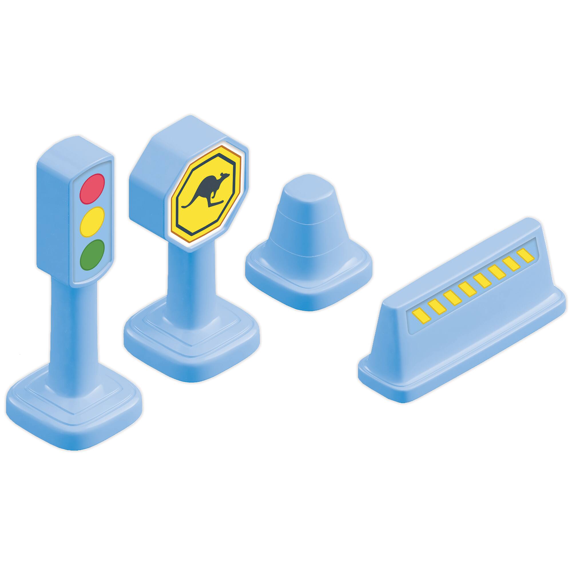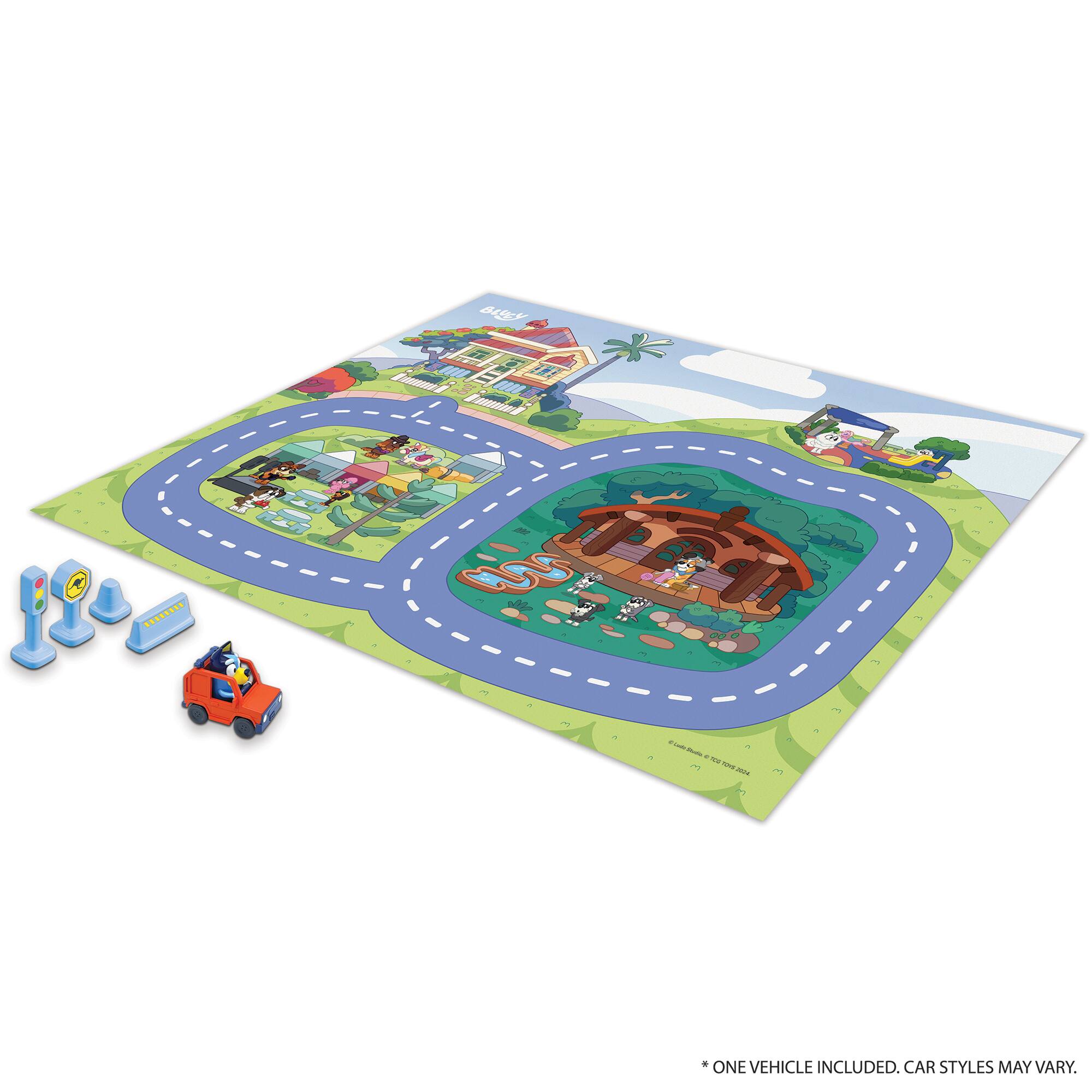 - A:Answer The playmat includes a character vehicle and four road accessories: a traffic light, stop sign, pylon, and caution sign.
