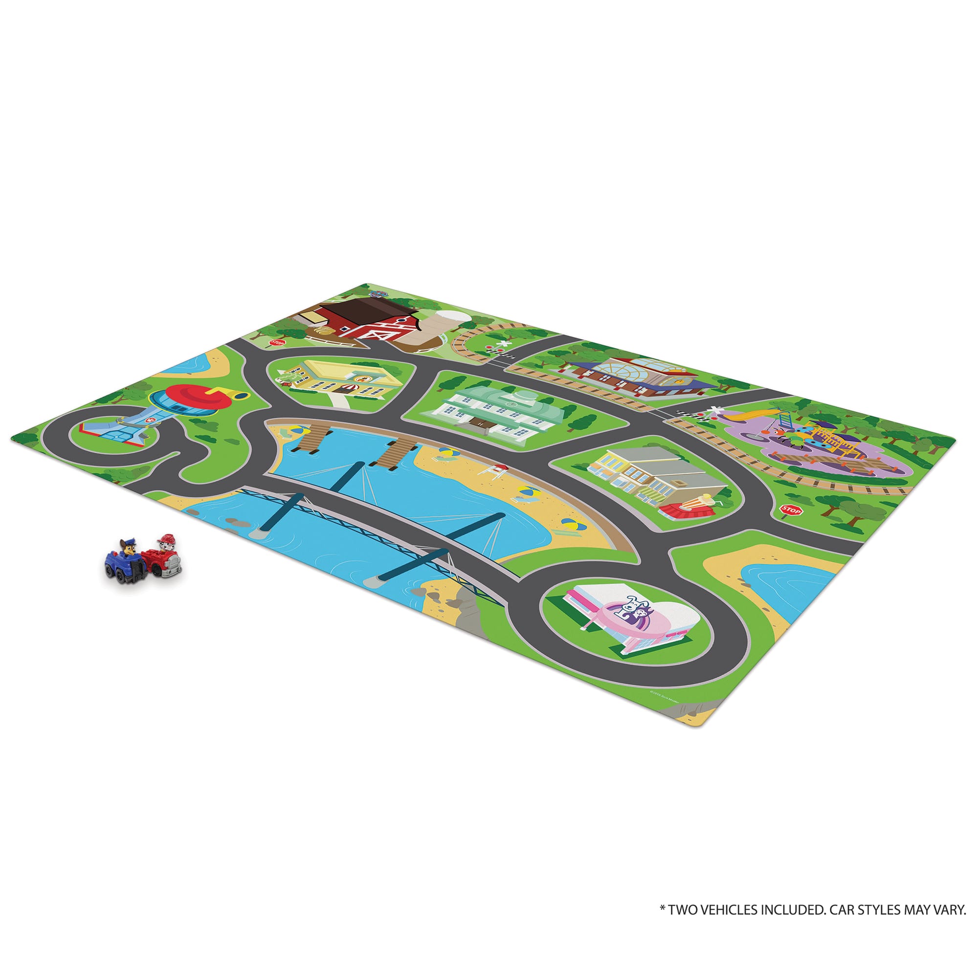 - A:Answer The playmat includes two character vehicles and four road accessories.