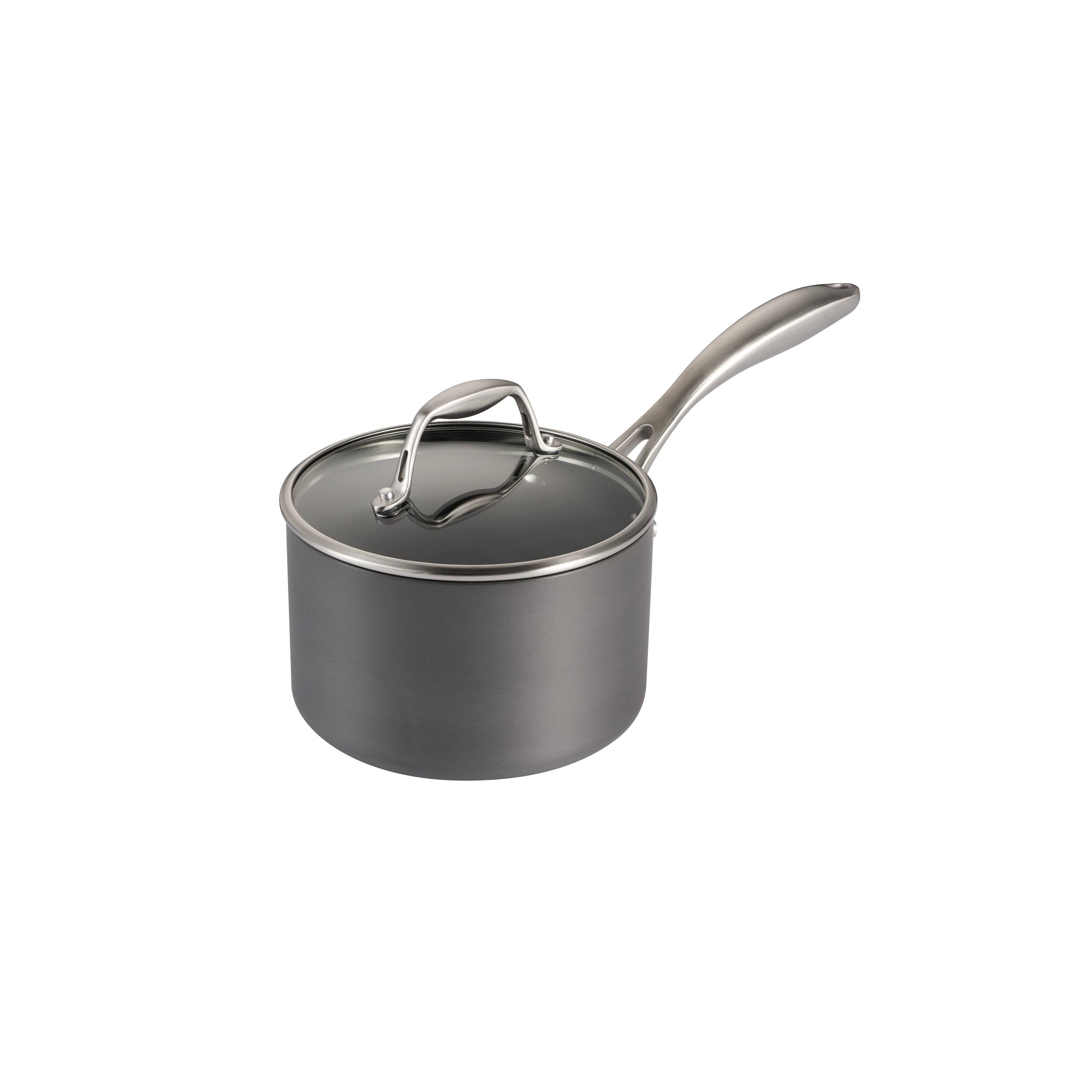 - A:Answer The Tramontina's Gourmet 8 Pc Hard Anodized Aluminum Cookware Set includes an 8-inch sauté pan, a 10-inch sauté pan, a 2-quart covered sauce pan, a 3-quart covered sauce pan, and a 5-quart covered Dutch oven. Each item is made with heavy- gauge aluminum construction that allows for reliable uniformity. The flared edges and heat and shatter-resistant glass lid help reduce spills and splatters.