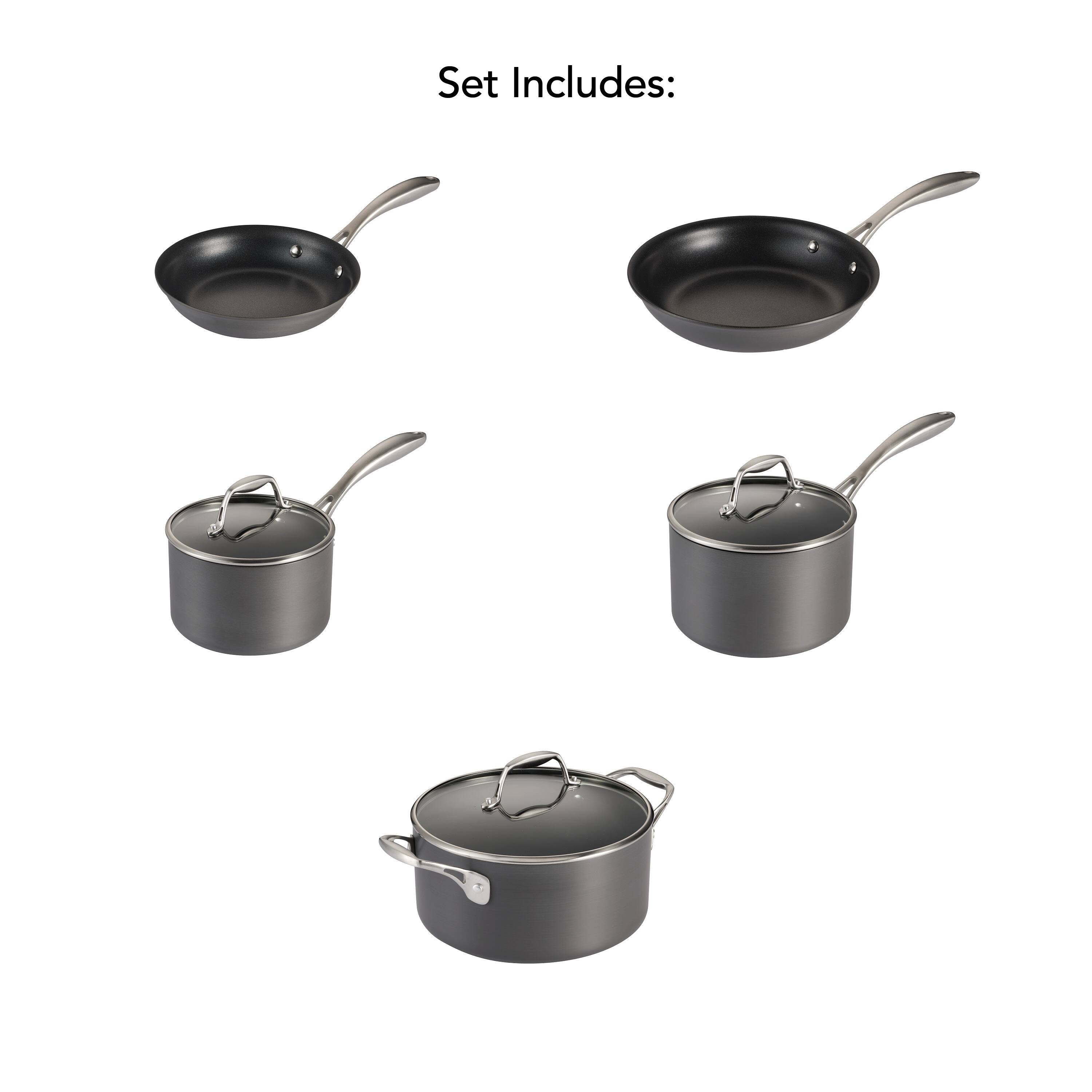 - A:Answer The Tramontina's Gourmet 8 Pc Hard Anodized Aluminum Cookware Set includes: 8 in Sauté Pan, 10 in Sauté Pan, 2 qt Covered Sauce Pan, 3 qt Covered Sauce Pan, 5 qt Covered Dutch Oven.