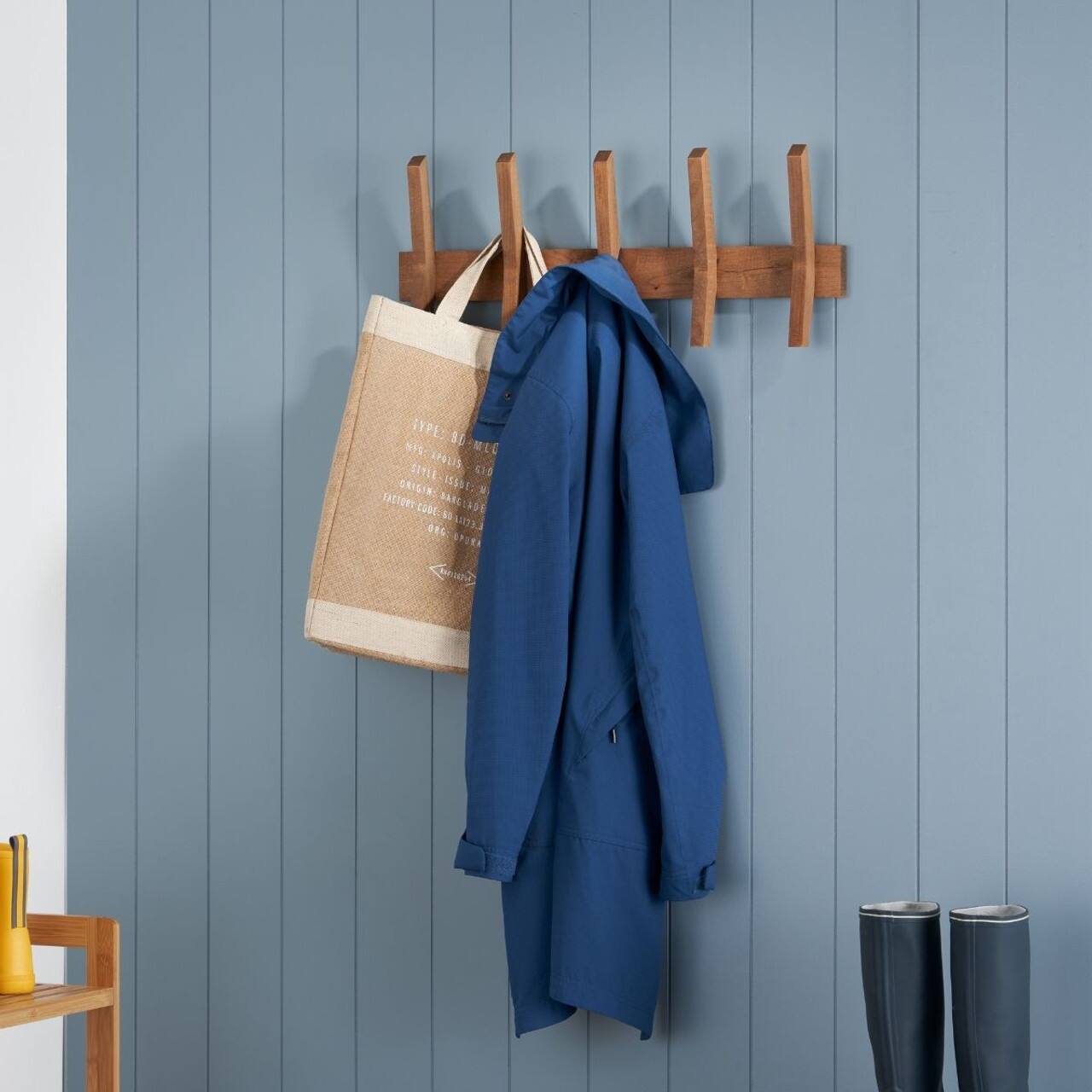 - A:Answer The coat rack has five wooden hooks.