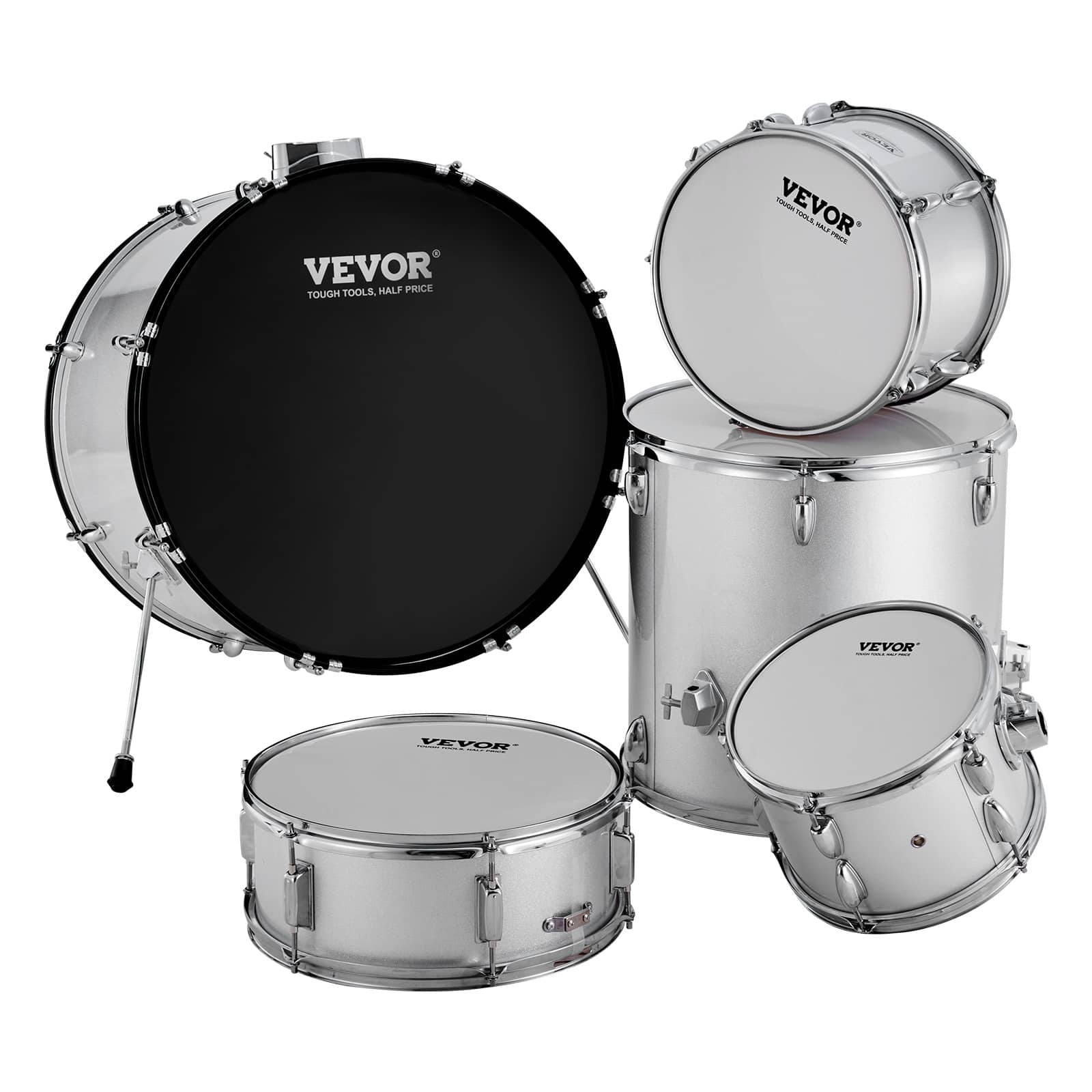 VEVOR - Adult Drum Set, 5-Piece, 22 inches Complete Full Size Drum Kit with Bass Toms Snare Floor Drum Adjustable Throne Stands - Silver