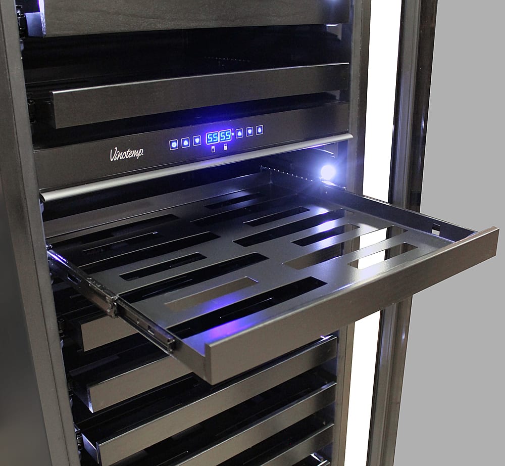 - A:Answer The shelves in the Vinotemp 126-Bottle Dual Zone Panel-Ready Wine Cooler are made of metal with a wooden lip. The wine cooler features 14 pull-out metal shelves, each with a wooden lip, providing a sturdy and elegant storage solution for your wine collection.