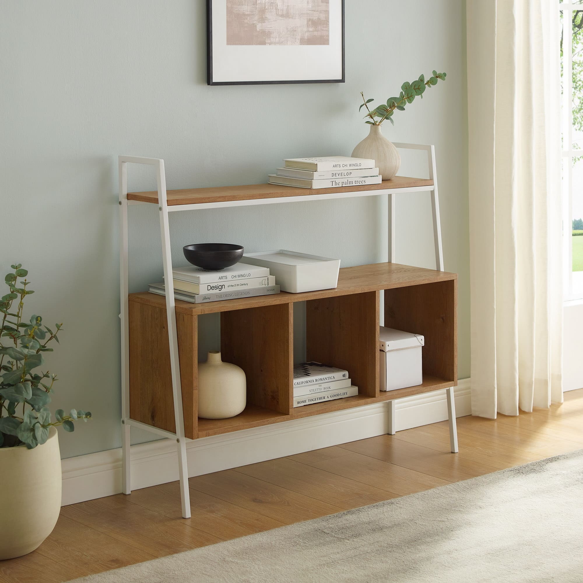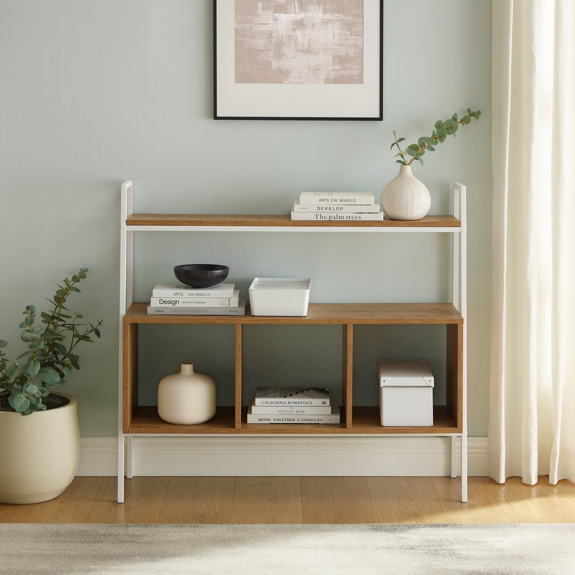 - A:Answer This storage shelf can be placed in a guest bedroom and used as a media console.
