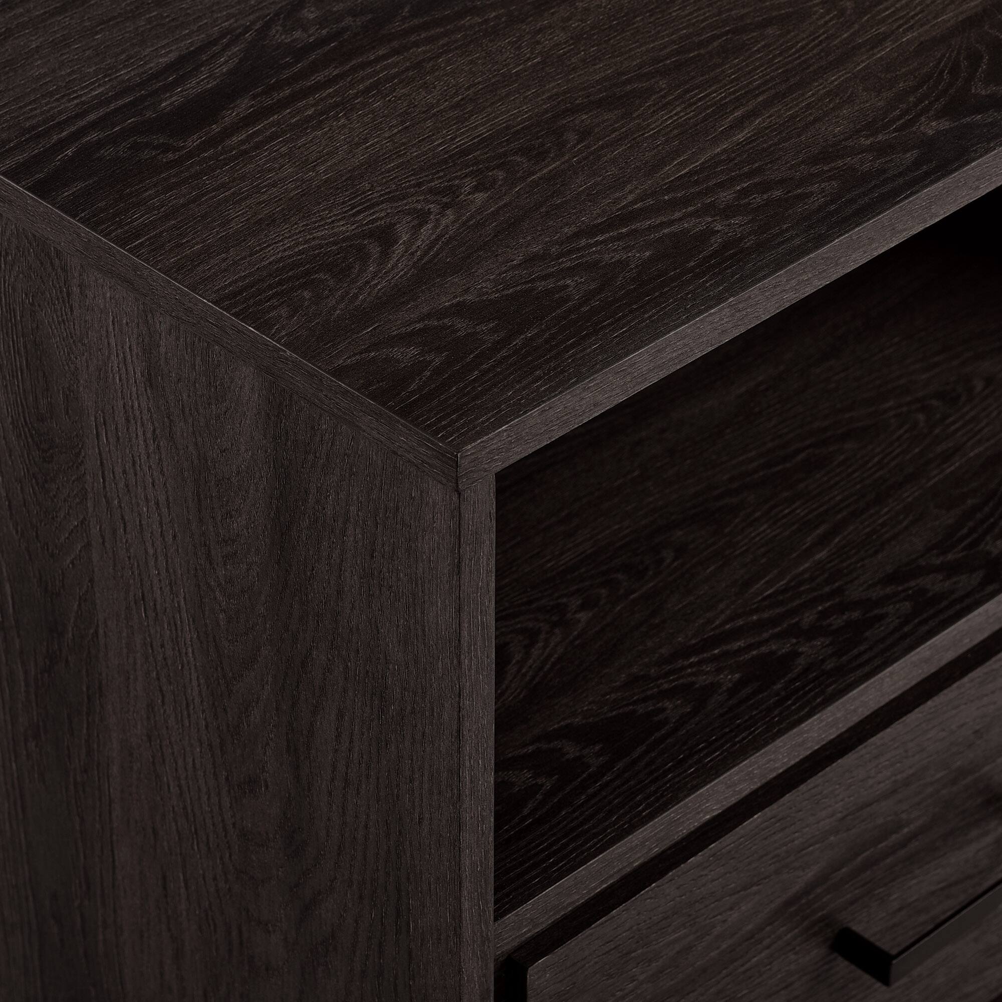 - A:Answer This stylish nightstand combines a woodgrain laminate finish with modern metal legs. The tabletop is also made of laminate, while the base material is steel.