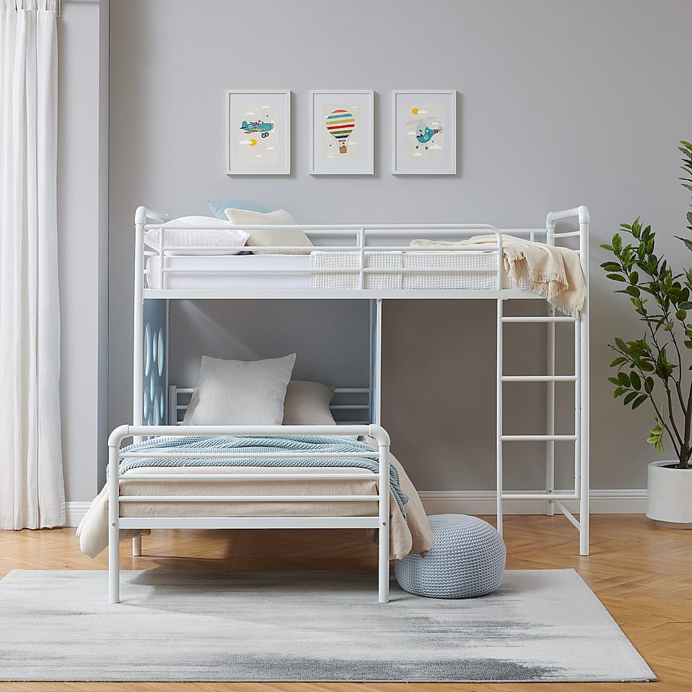 - A:Answer The product weight of the Modern L-Shape Twin Bunk Bed is 139 pounds.