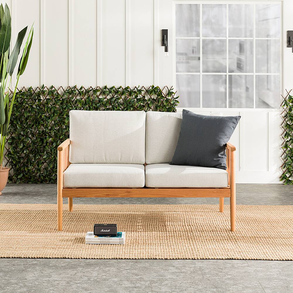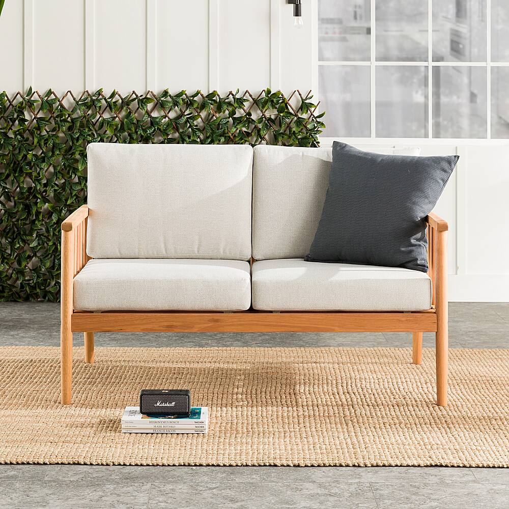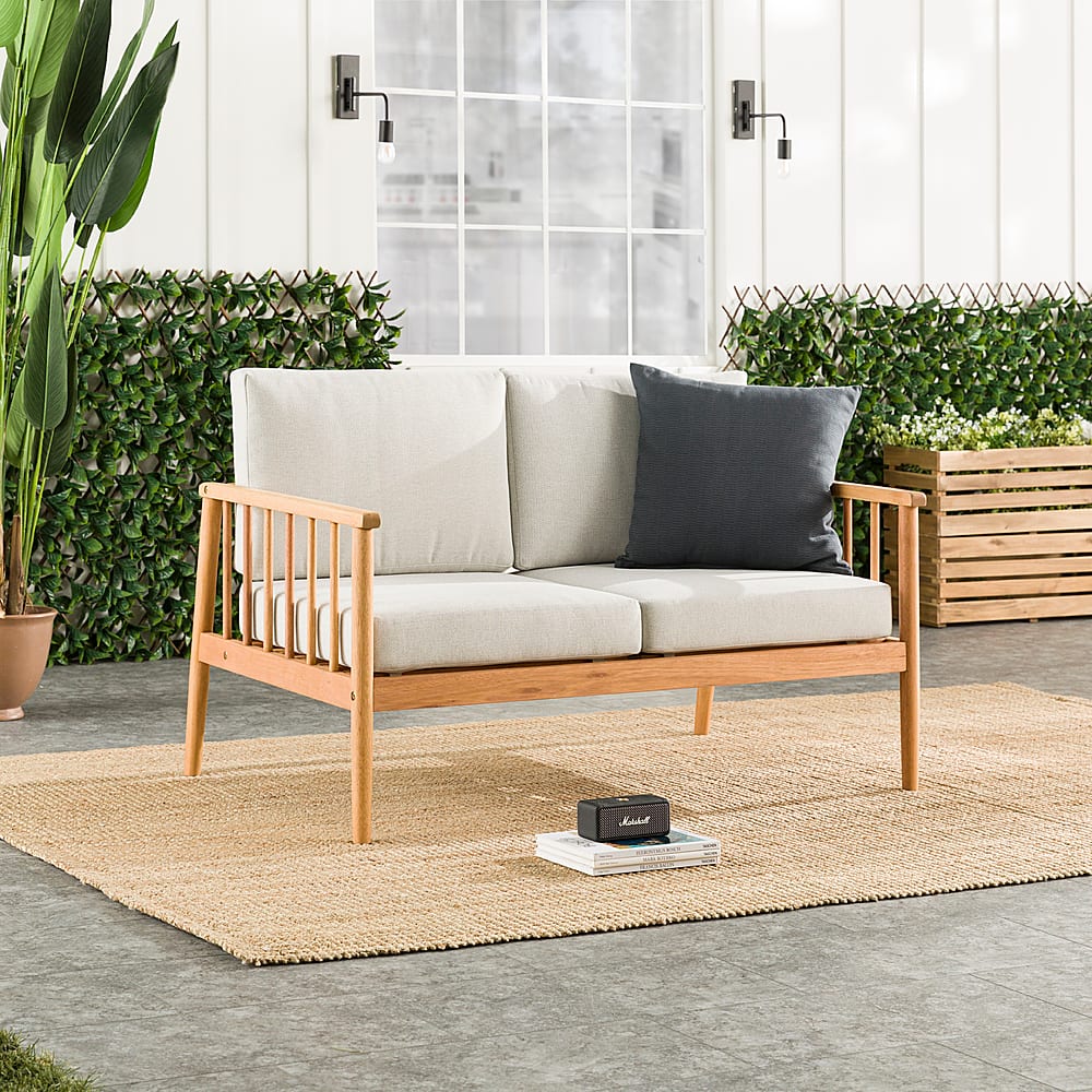 - A:Answer The product weight of the Modern Solid Wood Spindle-Style Outdoor Loveseat is 55 pounds.