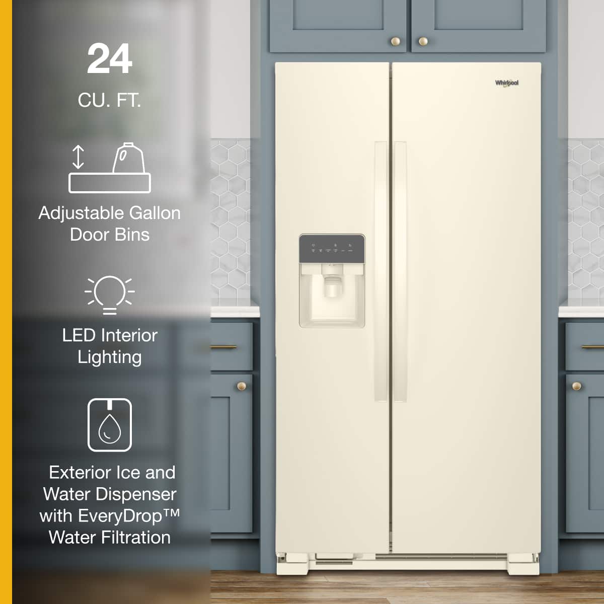 A:AnswerMary, the depth of this Refrigerator is 33 5/8 inches. Hopefully, this information is beneficial to you. Thank you for your inquiry regarding our Whirlpool Appliances!