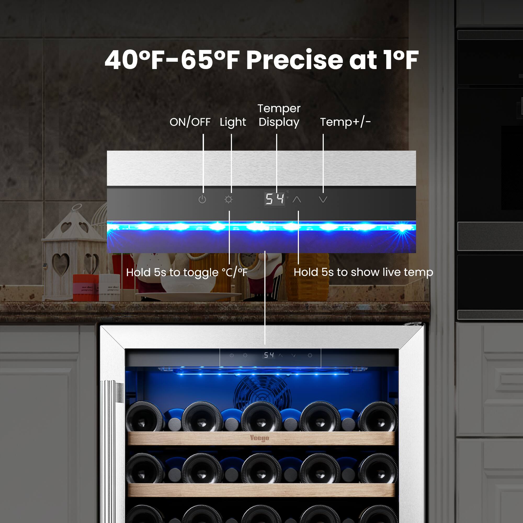 - A:Answer Offering a temperature range of 40–65°F with accurate 1°F adjustments, this wine cooler ensures your reds, whites, and champagnes are stored in their ideal conditions. It also features a power failure memory function, internal fan circulation, and a carbon filter system to maintain freshness. A soft blue LED light adds an elegant glow to your collection.