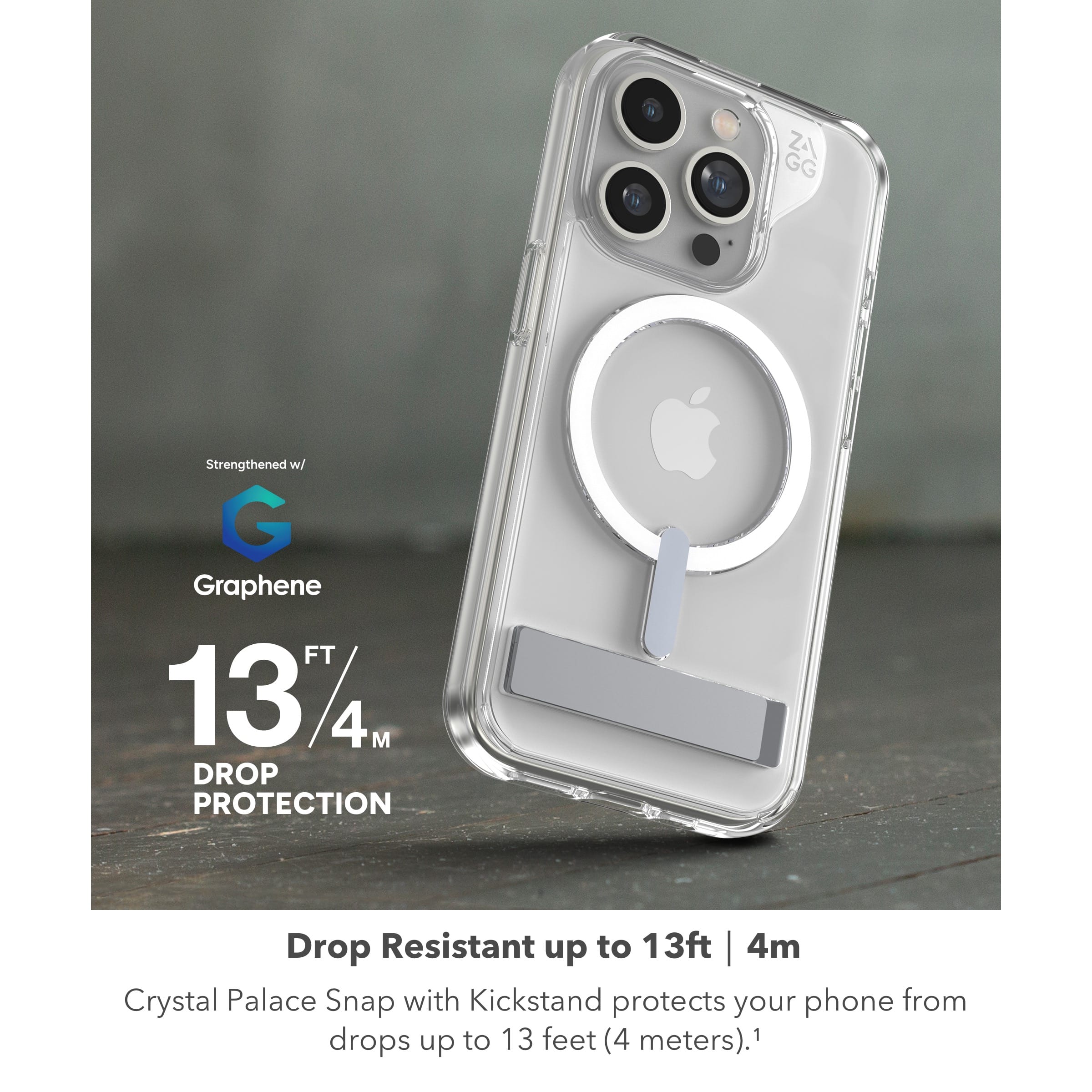 - A:Answer The Crystal Palace Snap with Kickstand case has been tested to protect your phone from drops up to 13 feet (4 meters).