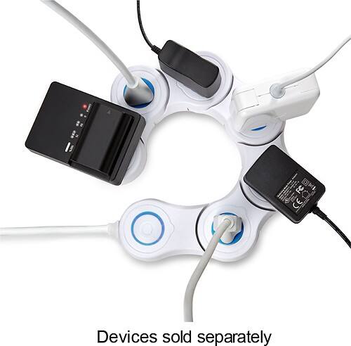 The 6 outlets on this Quirky Pivot Power PPVP1-XWHT surge protector adjust to accommodate adapters of various sizes. The flexible design pivots around furniture and other objects to allow versatile placement.