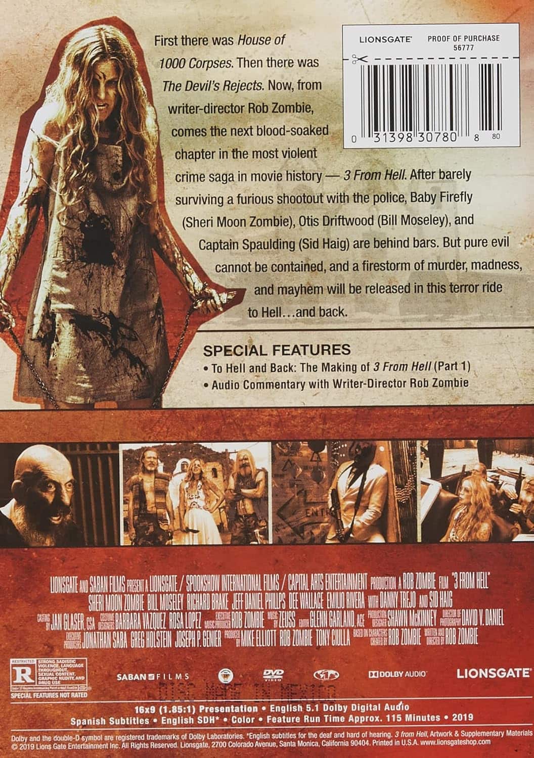 3 From Hell is the follow up film to The Devil's Reject's, arguably Zombie's best film to date. The isn't as good as Reject's, but I do believe if you liked House of 1000 Corpses and Rejects, you should enjoy this one. The picture quality is really good and the audio does its job. There are only two special features on this release but they are good. You get a feature commentary with Rob Zombie and also a 4-part documentary that runs over 90 minutes in length.