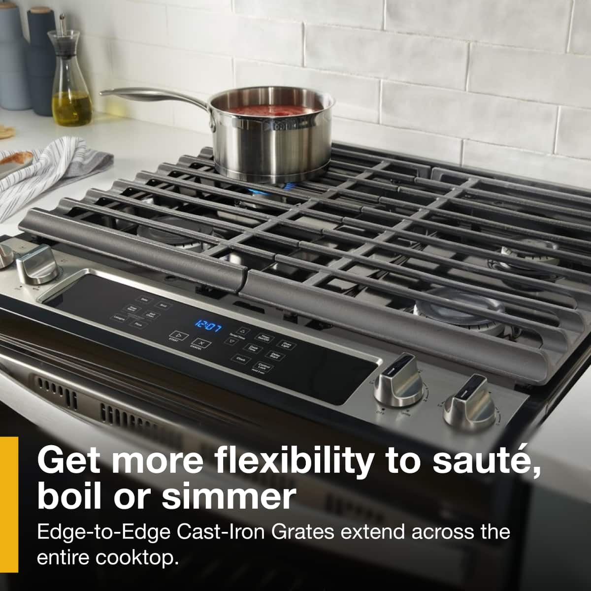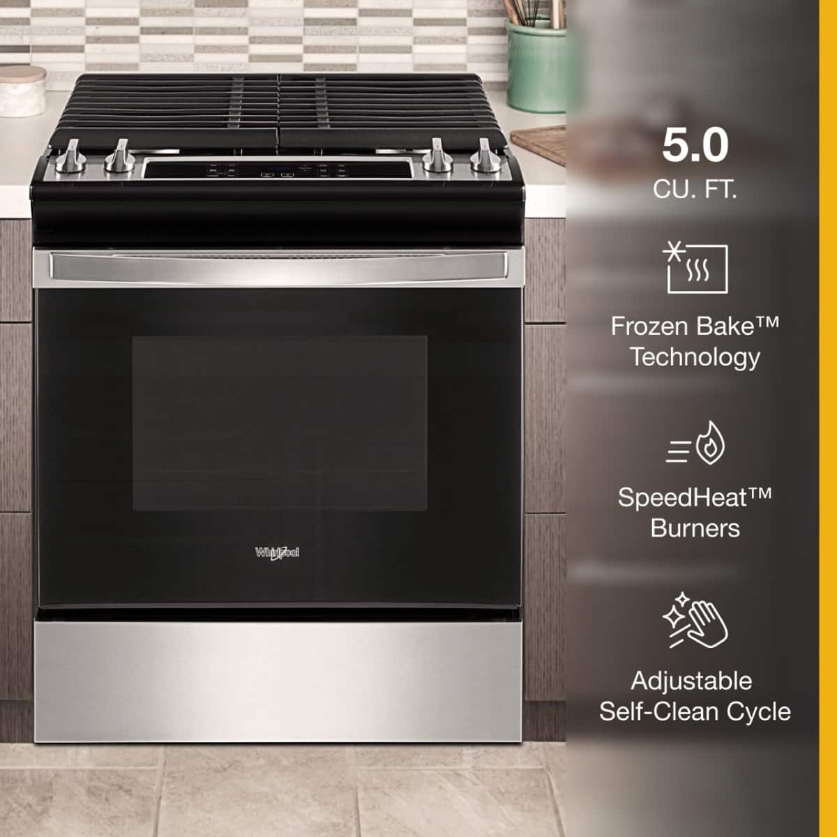 Customers are positive about the appearance of the 5.0 Cu. Ft. Gas Range with Frozen Bake Technology. Many appreciate its attractive design and how well it complements their kitchen. The high heat burners also receive praise for their efficiency in boiling water and cooking food quickly. No negative customer feedback was provided.