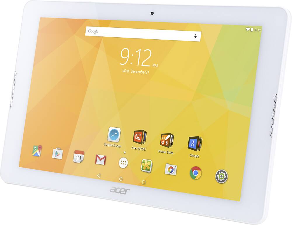 The Android based Acer Iconia One 32gb Wi-Fi Tablet is equipped with a 10.1” backlit LED touchscreen with a resolution of 1280x800, 1.30 GHz Quad-core MediaTek Cortex A53 MT8163 Processor, 5 MP (Rear Camera), 2 MP (Front Camera), and Bluetooth 4.0, dual front facing speakers and a non-removable 6100 mAh Battery . The Android Operating System is 5.1 Lollipop.