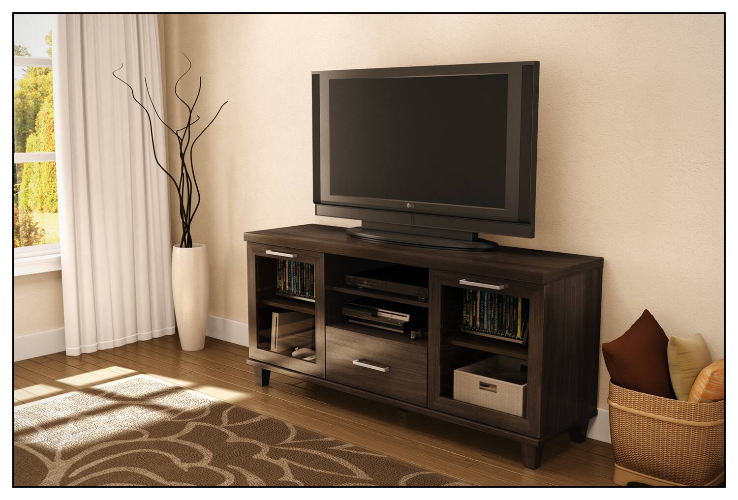 I was looking for a stand on which to place my new 60" Samsung. It did take some time to assemble, but when put together, this stand is beautiful and sturdy. It is the perfect size for the television due to its oversized TV stand. It has great storage for all of my components (PS3, Cable Box, Blu-Ray player, Logitech Hub) as well as a great amount of space left over for DVDs and unused remotes/mauals. I love the look of it with the rest of my furniture. I can't express enough how pleased I am with the product.