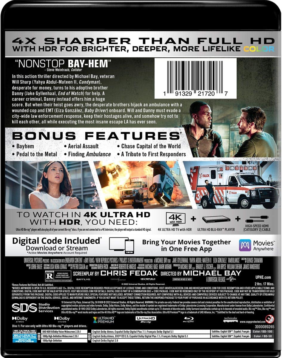 ||Posted . Owned for 7 months when reviewed.This reviewer received promo considerations or sweepstakes entry for writing a review.To begin I am not Bay's biggest fan, most of his filmography hasn't been my favorite aside from the first Transformers movie and Pain & Gain (which I still have issues with), but Ambulance is Bay on a whole nother level. It's a movie that's probably 30 minutes too long, but you don't care because Mateen II, Gonzalez, and Gyllenhaal carry this film through every checkpoint, and not to mention the fact that Bay made this film for 40 million dollars, but the fact that it feels like he managed to get his hands on 100 million is simply astonishing, showing us how important having a vision and voice is to filmmaking. Simply put, watch it and you'll fall in love with it.