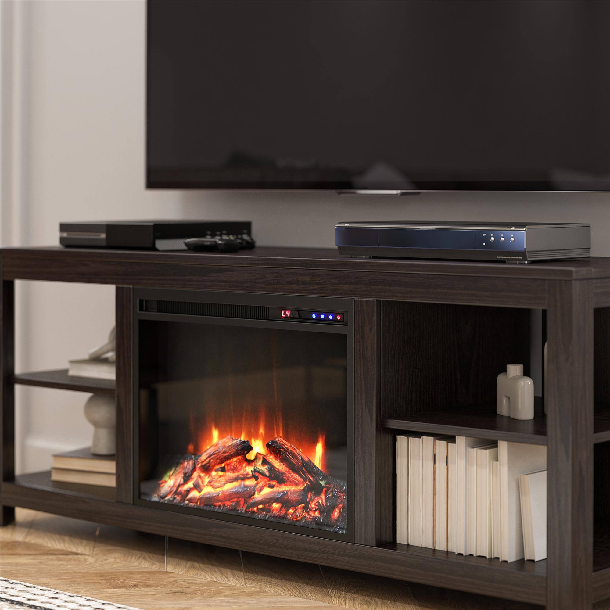 The overall look of the item is nice but the quality is horrible. The heater does not fit in its designated compartment unless you loosen other parts, which compromises the safety of the product. The wood is very weak and one side does not screw in properly at all and remains loose. Not sure if this will safely hold up my 65 in TV. Hopefully since it would have been too much of a hassle to return as I live on the top floor and they don’t just send individual pieces to correct the issue!