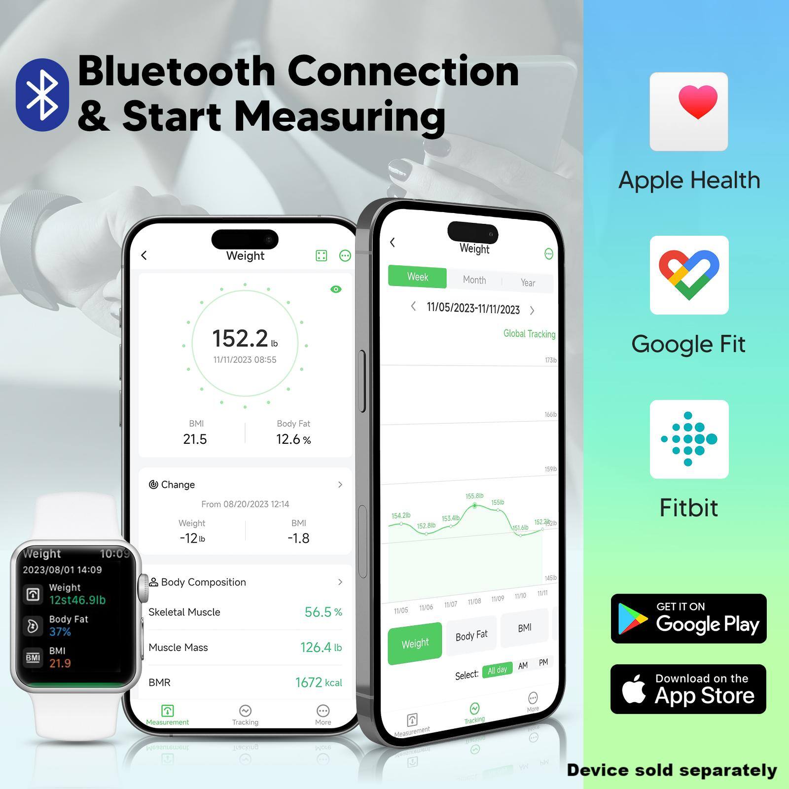 Excellent scale quickly reads your weight with large easy to read numbers. Includes other body measures by stepping on the scale with bare feet. The information is sent to a app on your phone and it works great.