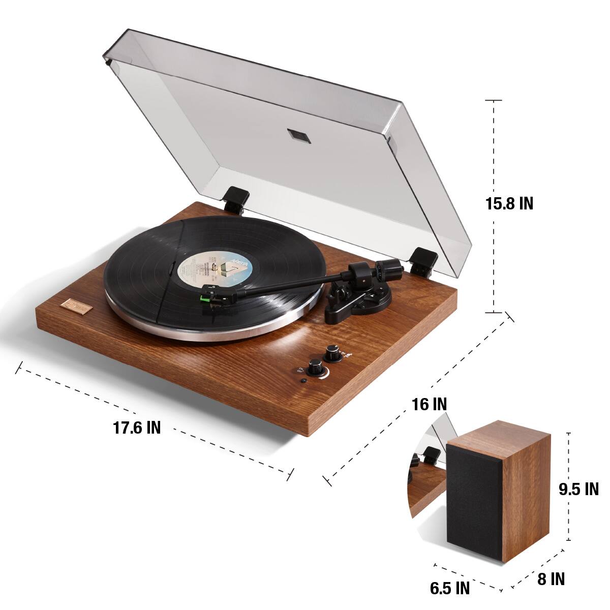 Product arrived in good condition, double boxed. Assembly is pretty straightforward. The provided speakers do a decent job and sound good. It’s not going to fill a large room with sound but works well for our purpose. This is a Solid made unit, has some weight to it . Note ; this is a manual turntable, it doesn’t start automatically. You must place the tone arm where you want it. It will stop automatically at the end of the record but again, it does not return back to the cradle. The record stops spinning and the tone arm stays in place . Better quality speakers can be added if you need a larger sound. Overall it’s a good unit and serves our purpose. It’s well made , sounds good and the price was right considering how much a turntable costs nowadays.