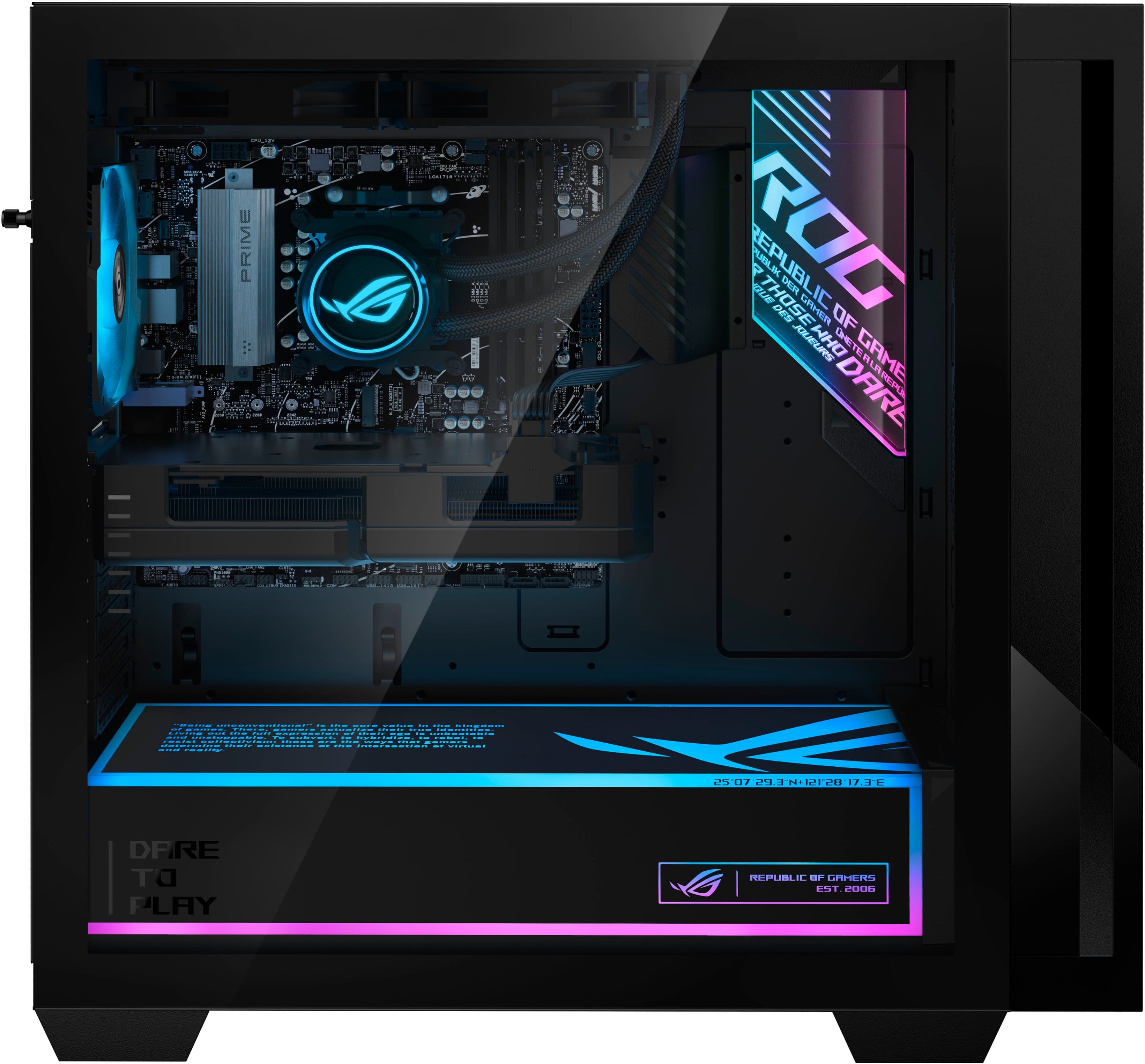 The chassis is sleek but functional, with excellent airflow and cable management. ASUS clearly put thought into component layout and accessibility—great for enthusiasts who plan to tweak or upgrade.