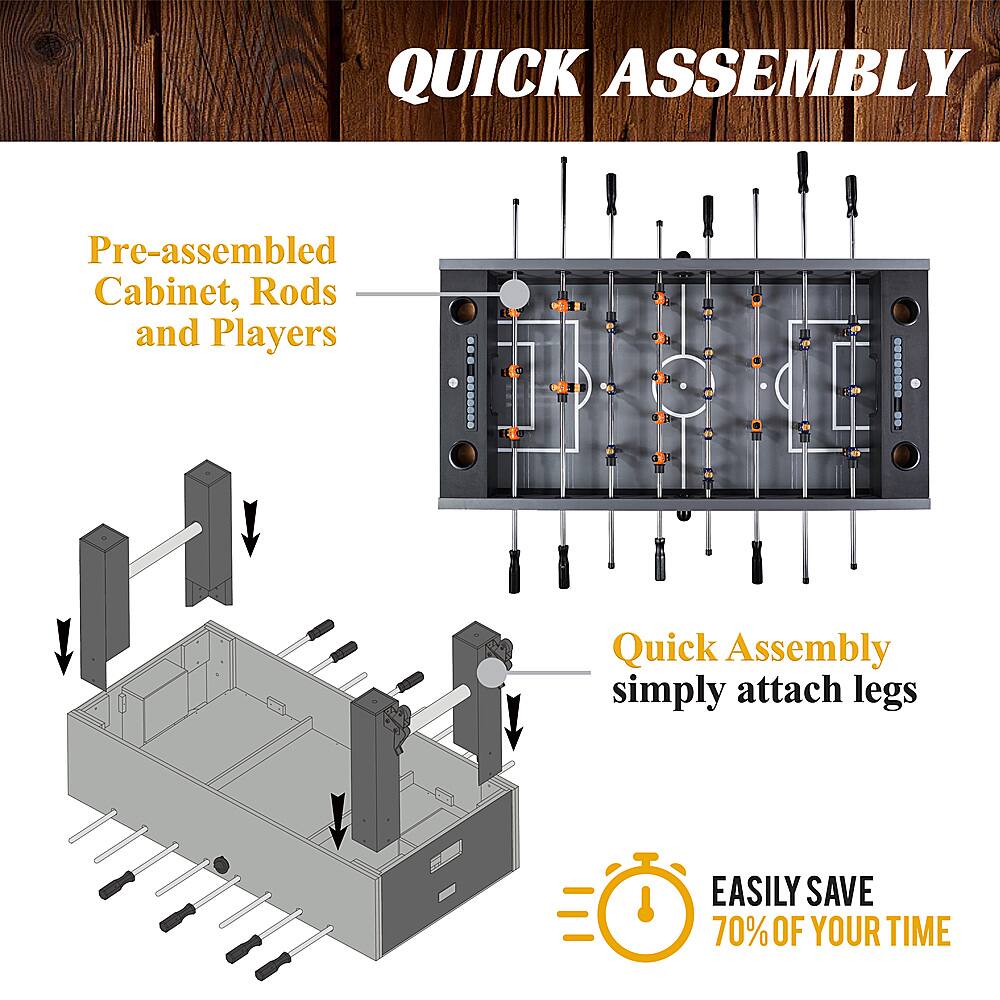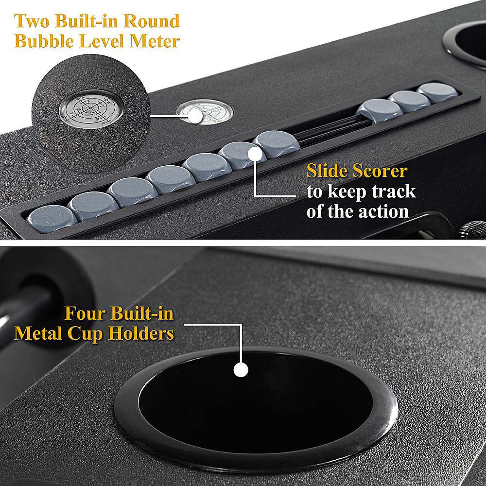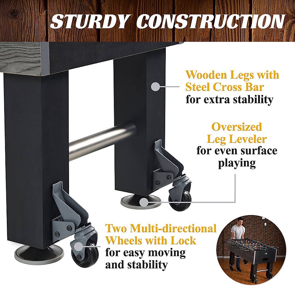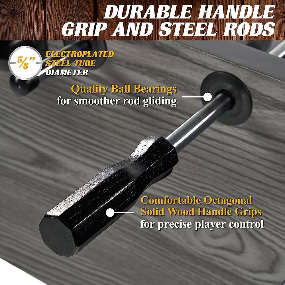 Ball bearings for quick moves and thick rods resist bending. Good looks too. Cupholders a little small, seem made for (beer) cans not your giant cups. Cool scoring bars. Very comfy wooden handles. You may need some kind of net for the ball return holes as the ball often pops out onto the floor on power shots (I'm still looking for one I lost the 1st day). I just used some of the packing.