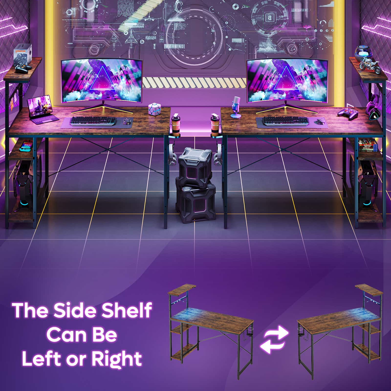 I love my new desk! It’s my very first gaming computer desk and more than happy. I’m also proud of myself for putting it together but not entirely by myself lol I purchased another desk from Bestier for my son for Christmas last year so he’s already familiar with putting the LED lights on. I had him do that part for me lol It’s quite easy to install and I’m almost 40! Only critique that I have about it is the shelves. I wish the shelves had some kind of backing so that your stuff wont fall off the sides. The shelves are supported by nothing. It’s just ooen soace from side to side. But other than that I love it! Im able to fit two computer screens on the desk. I really love that it has tiny little magnets to hang small notes and I love the water bottle holder. Thanks Bestier!