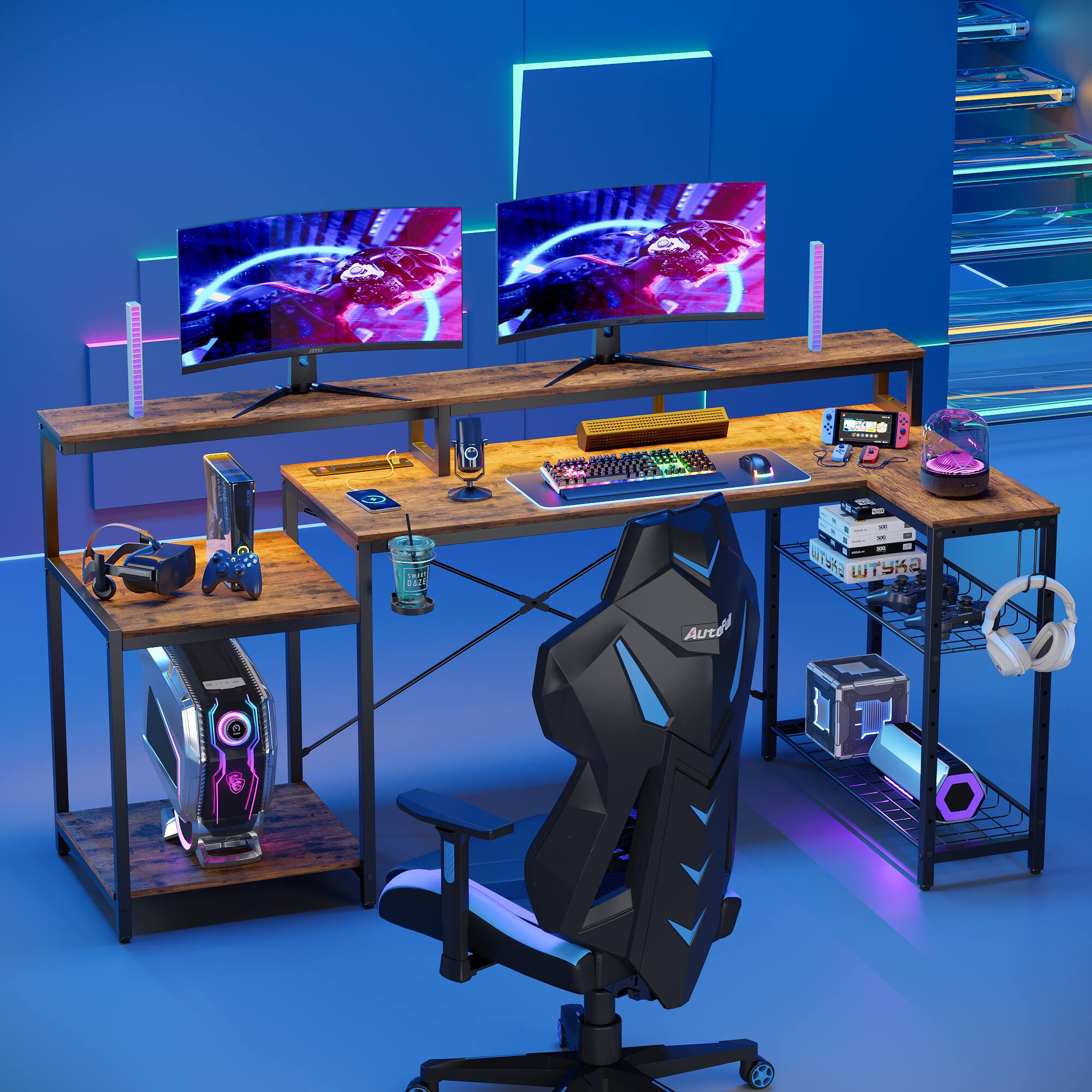 Terrible gaming desktop, cheap LED's and a subar power bar with 2 USB ports, not very sturdy and top heavy, took around 3 hours to put together by myself. Space consolidation is janky with the racks and shelving, Takes up too much room space but not spacious enough for two modern 32 inch monitors without mounting arms. Drink and headphone holders are cheap. Paid less than $50 with sale price and best buy rewards and still paid too much.