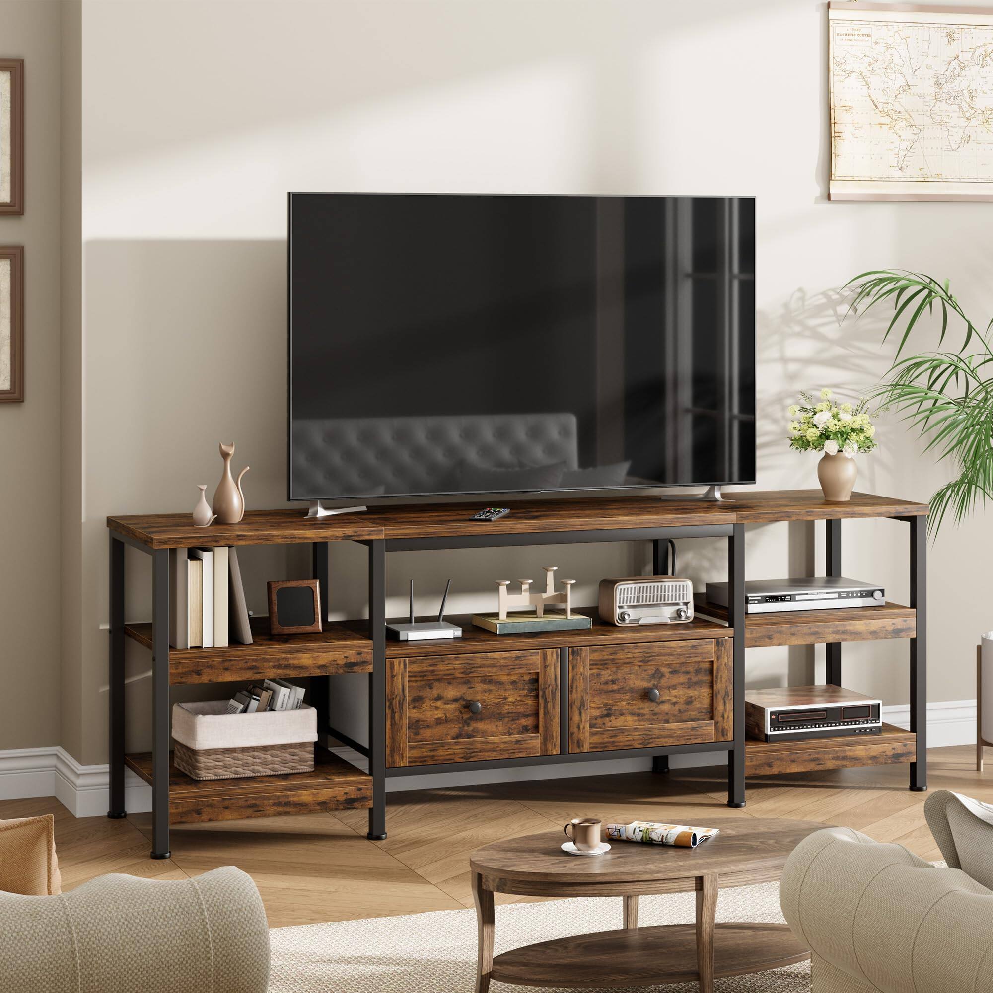 Love the look and length. The legs are a bit weak for my 83” television to sit atop, but work. The depth could have been 5” more to allow the sound bar to fit. Would have given 5 stars if not for the aforementioned stability issue caused by the narrow depth and poor leg support. The instructions do mention adding wall straps or something similar to prevent tipping.