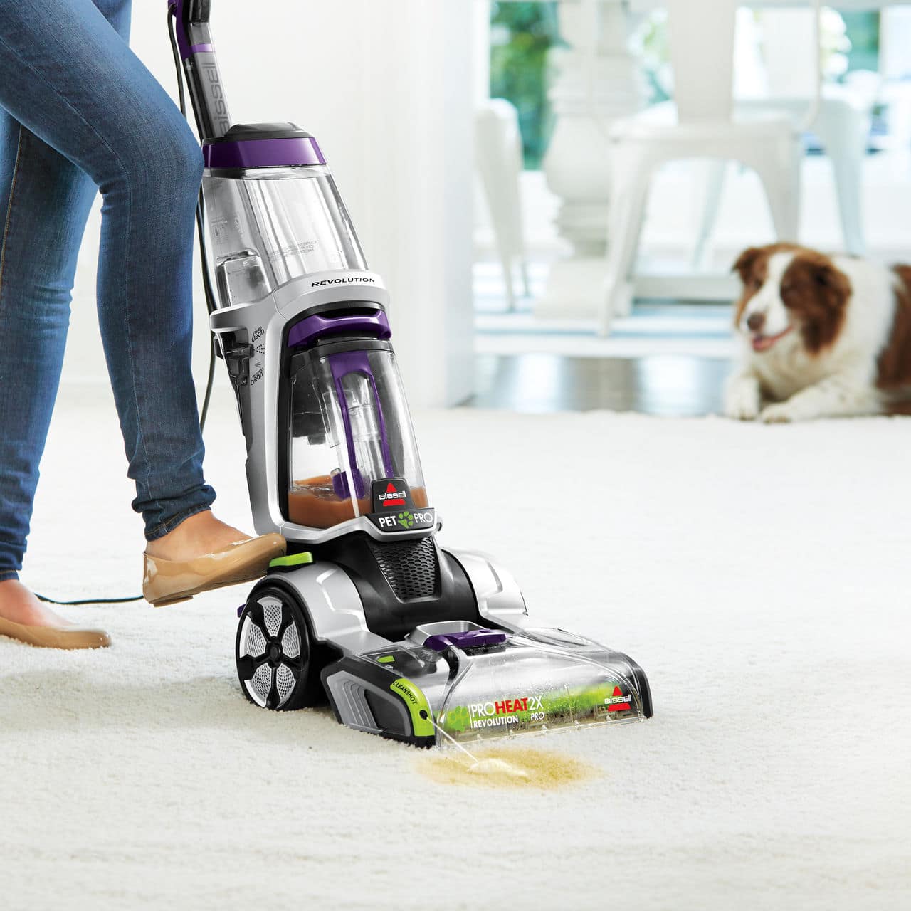 After carefully reading and considering all the reviews, we decided to give the purple and silver a try. I am THRILLED with our new shampooer! We inherited three houses with 10 - 40 year old wall to wall carpeting - two even have carpet in the kitchen! :( We've been cleaning regularly with 2 previous other brand machines that did ok - or so I thought. I can hardly believe the difference! What I discovered was that the other machines weren't getting up the shampoo! I spent 2+ hours just going over one carpet again and again with plain water after I had shampooed it. The kitchen carpet was FILTHY! The machine just kept pulling out more and more dirt and old shampoo. Even the nap on the carpets has been restored. We keep going in just to look at how clean they are now. - so clean that they squeak when we walked on them! Some stains are permanent, but at least I know they are clean now! Even with how many times I re-cleaned and rinsed, the carpets were still dry by morning. Love the special sprayer for spots - we had a bunch. You just have to be ready to shut it off. Super easy to clean up the machine compared to my old cleaner. Love the flexible insert to get out stuck muck. Cover easily came off and reattached! The dirty water tank does fill up quick, but so did the tanks on my other machines. Not a big deal considering how well it cleaned. The double roller really makes a difference. We got an extended warranty as I anticipate this cleaner will see hard use! Thank you Bissell. I am VERY happy!