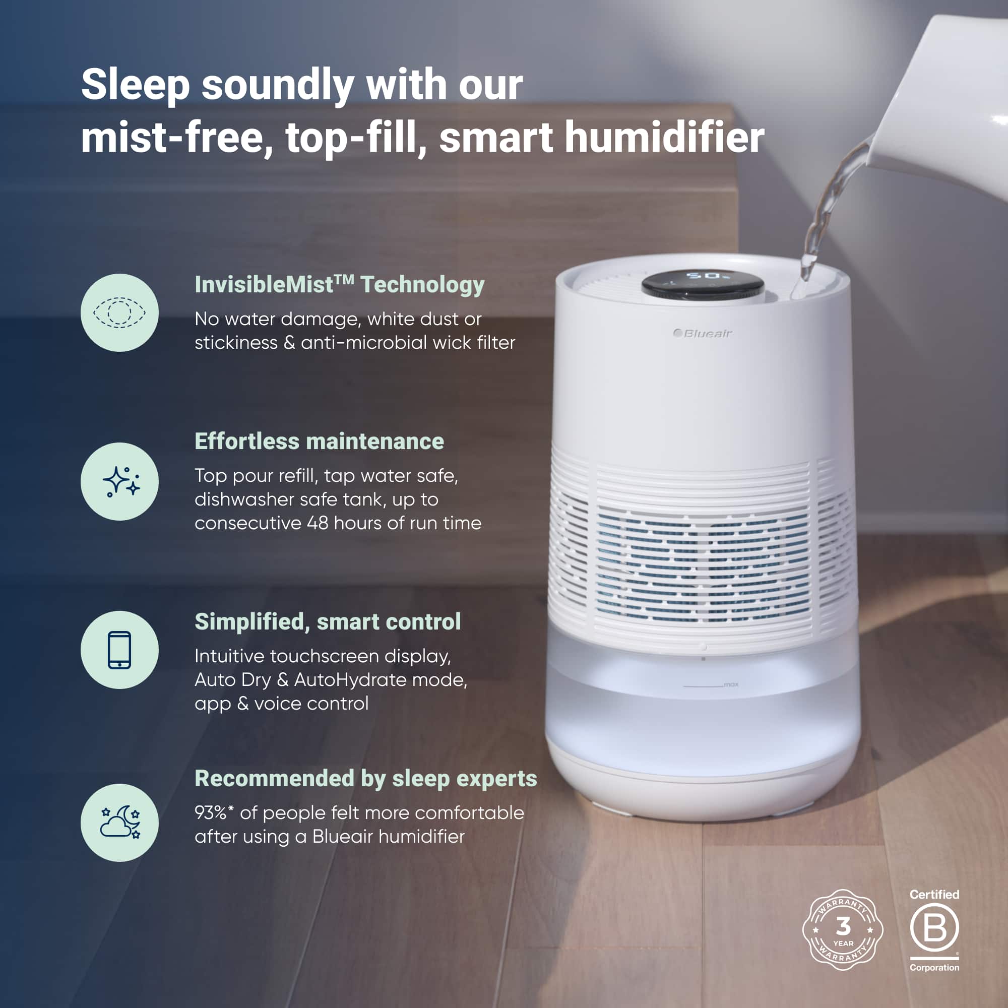 ||Posted . Owned for 3 weeks when reviewed.This reviewer received promo considerations or sweepstakes entry for writing a review.Owned BlueAir Air Purifier and like desgn and app is decent. Dry house in winter, reviewed Consumer Reports and this is the highest ranked to cover a large bedroom. First shipment was a dud, electronics didn’t turn on. Local Best Buy store made for easy return and reorder. Next shipment worked fine. Easy setup and can control from app. Nice design, good rubber feet keeps secure on counter/furniture. Holds almost a gallon of water. Puts about a gallon into yhe air about every 18-24 hours, shooting for 42% humidity. BlueAir website seems to have issue, not letting me place a filter order for the air purifier, get in a continual loop when trying to checkout and BlueAir Customer Service was non-responsive. Fortunately, was able to order the purifier filter replacement from Best Buy, hope Best Buy will also carry the humidifier filters.