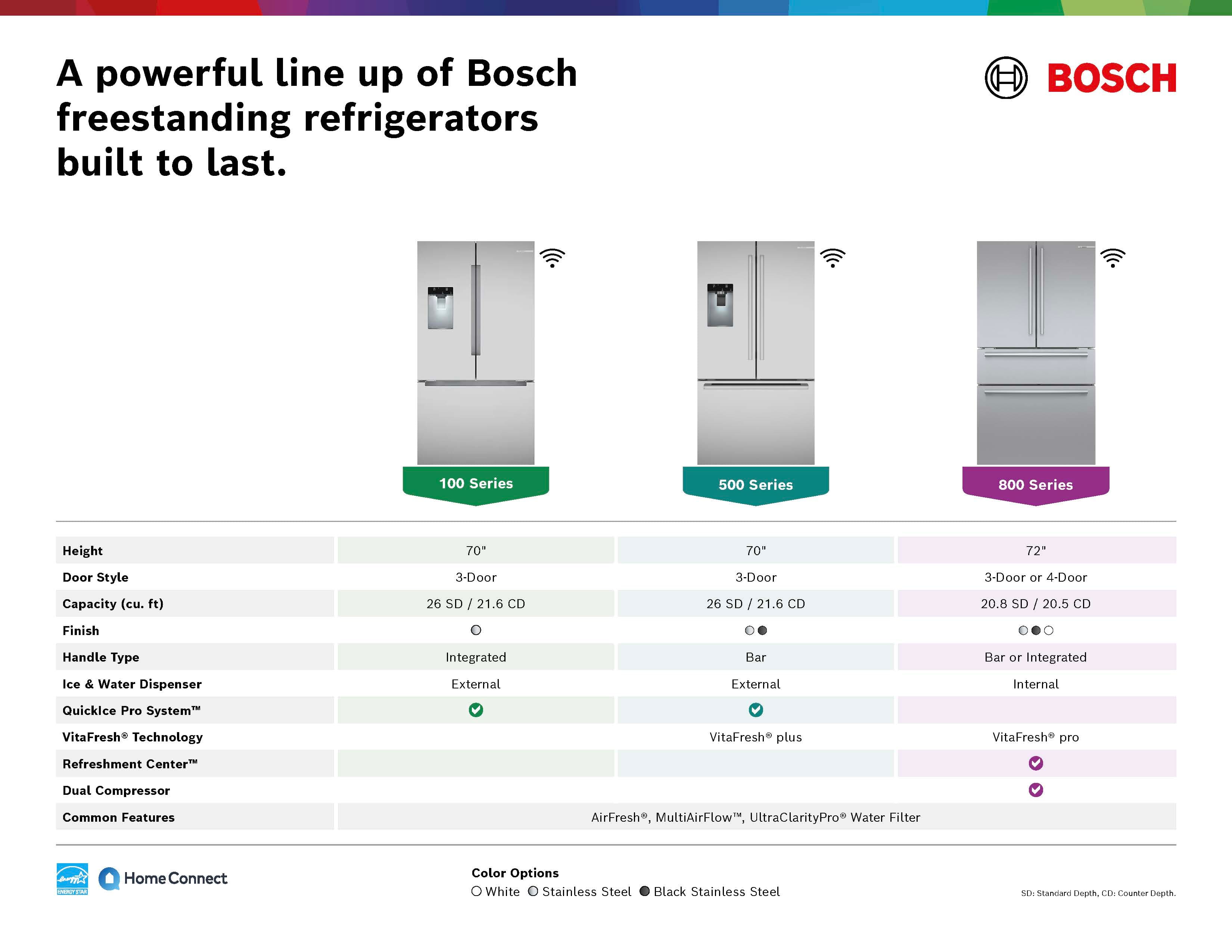Our Amana stopped working after 17 years (not bad). After some internet search we went to Home Depot, however, most of the products we liked would not be delivered with a week. At Best Buy we noticed Bosch 800 and it was visually very appealing. At PC Richard we were quoted price $200 lower, and Best Buy matched that. The product was deliver and installed (but not leveled) within one week, the old Amana was hauled away for recycling. It took some time to get use to the french door, now we actually like it. Bosch800 is a good appliance, very quiet, hope it will last 18 years.