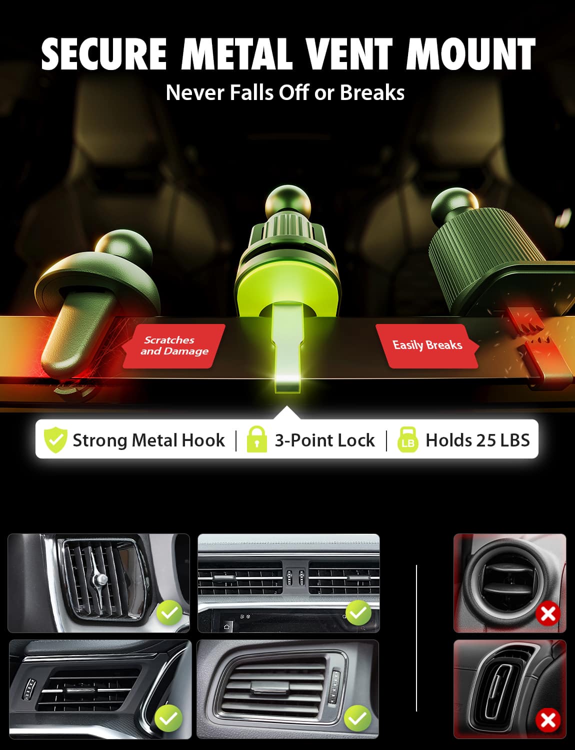 ||Posted . Owned for less than 1 week when reviewed.This reviewer received promo considerations or sweepstakes entry for writing a review.Like that it's got The ability to be on the dash and to be inserted into the vent