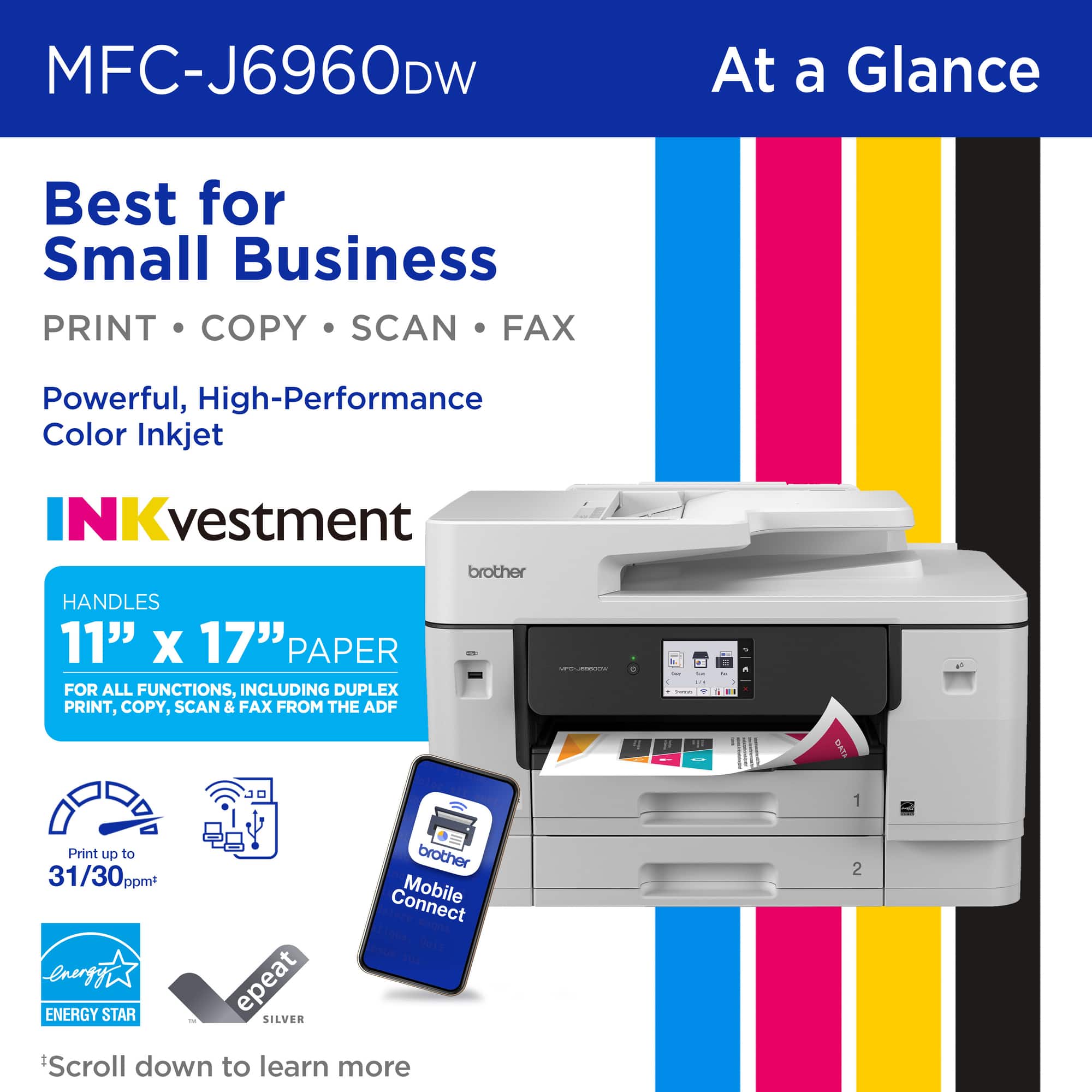 The Brother INKvestment 6960 Wireless Color All-in-One Inkjet Printer is one of Brother’s latest offerings. This is a powerhouse of a printer with features that make it suitable for both residential or commercial applications. These include dual paper trays, multipurpose tray, single-pass duplex copy and scan, automatic duplex printing, and paper capabilities up to 11 x 17”; this printer is a standout option.