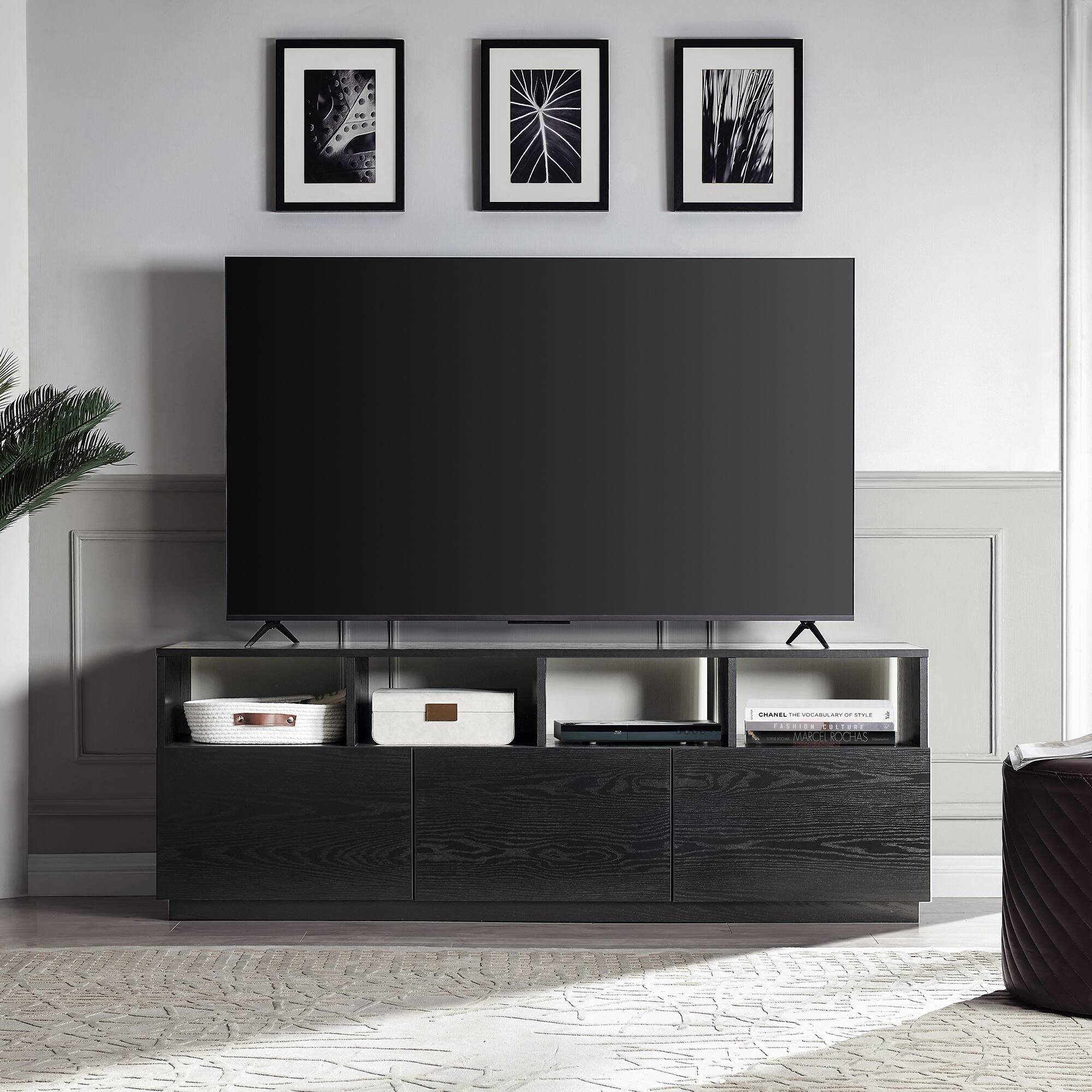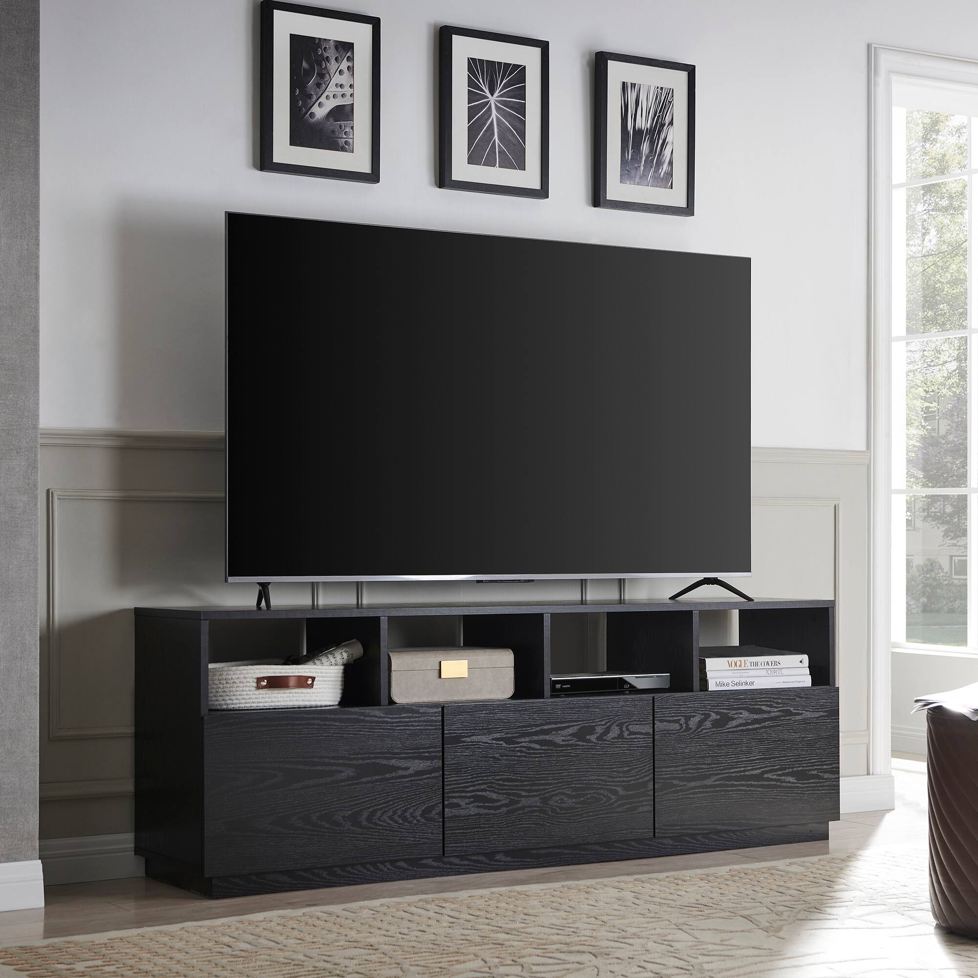 I love my Camden & Wells Cumberland TV Stand. Black Grain. It took me a while to put it together (by myself). But i got it. It looks so good in my living room. Not too big not too small. The compartments are just to doe for. Sleek and fancy. I would definitely recommend. The only complaint i have is that the screws in the compartment easy comes out. Had to replace wirh bigger screws.