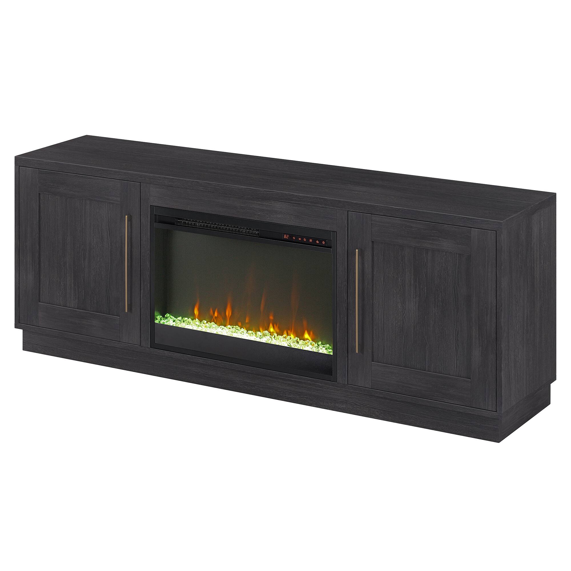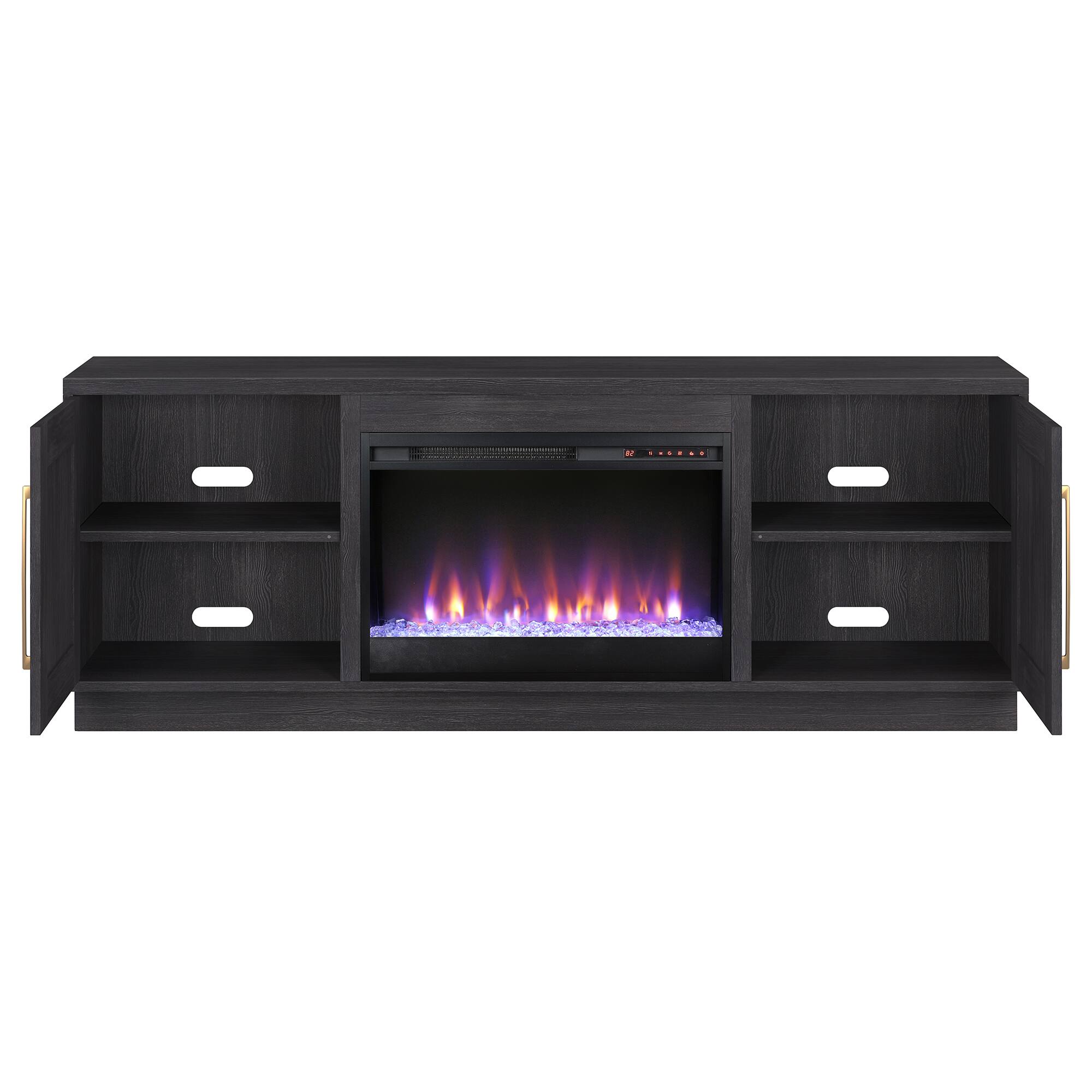 Fits my tv perfectly it is a 75" and cabinets are nice,well put together and love the fireplace. Very nice changes colors on flames and rocks or can set to desired color combo.