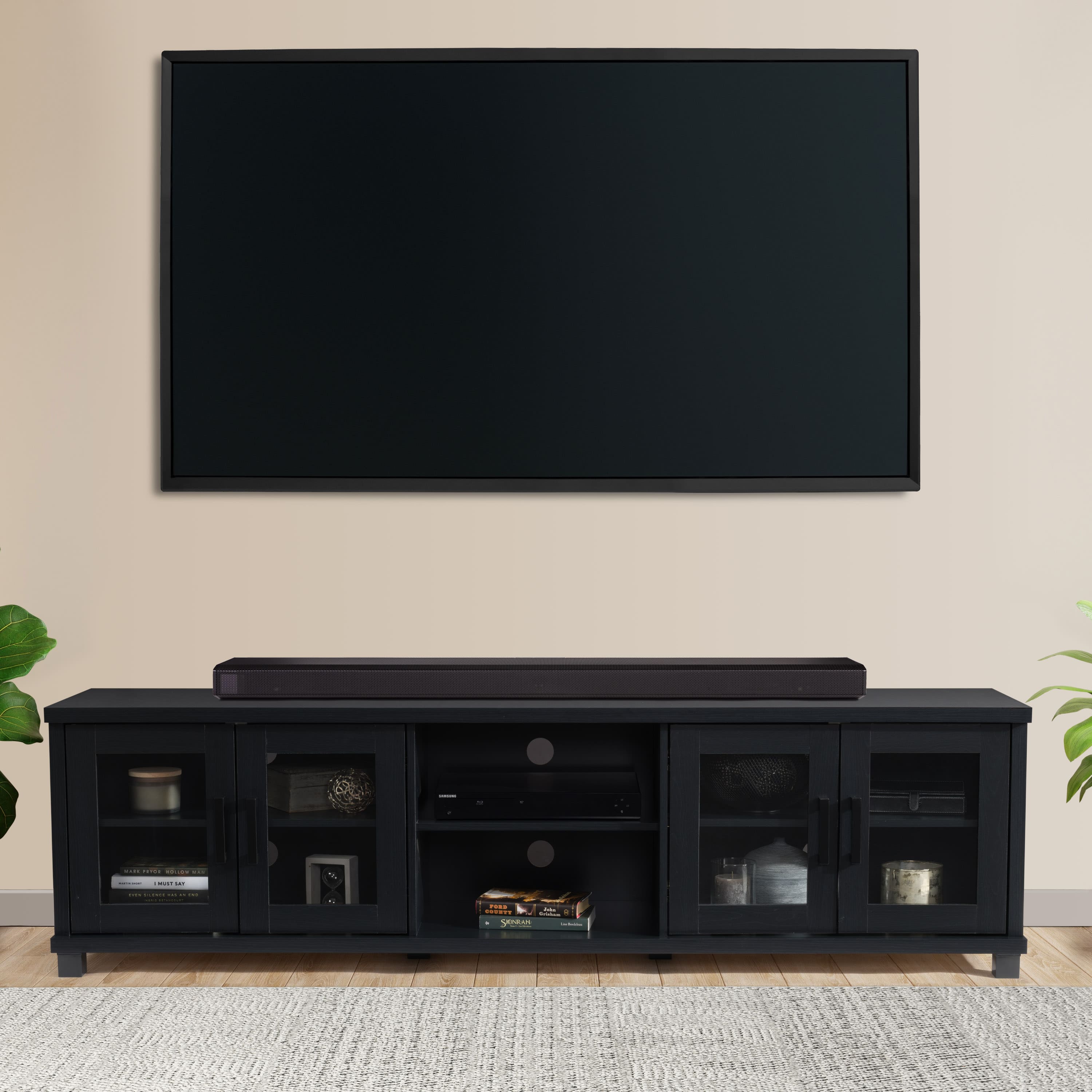 When shopping around for an entertainment center (particularly one that would suffice for a 85-inch tv), one of my main priorities was not just the look but also the amount of storage room. This has by far the most that uce seen! Its also very sturdy, as it has held my Sony perfectly. 100% would recommend!