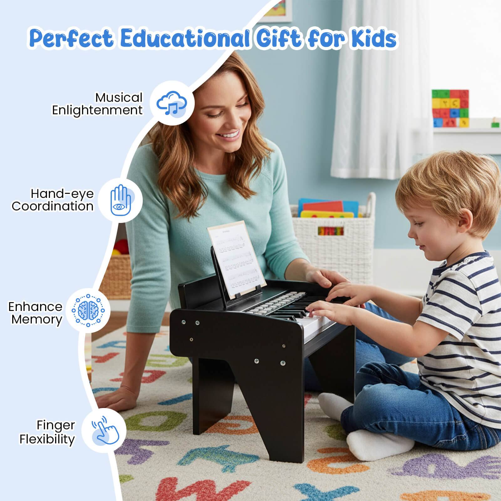 ||Posted .This reviewer received promo considerations or sweepstakes entry for writing a review.Easy to assemble. The grandchildren love it. I love the tutorial. I think I could learn to play the piano if it were mine.