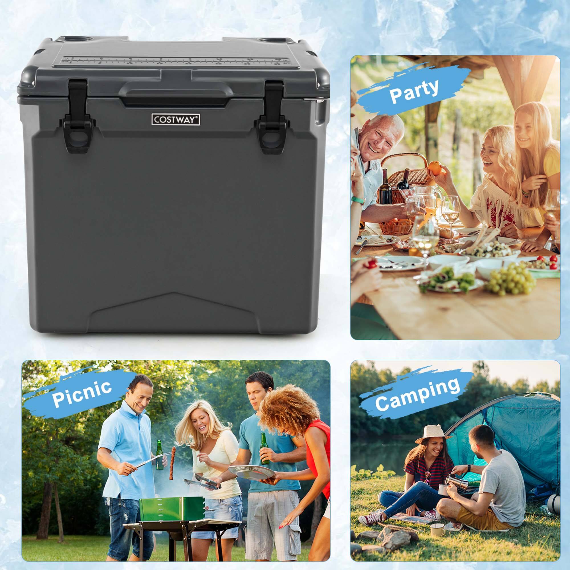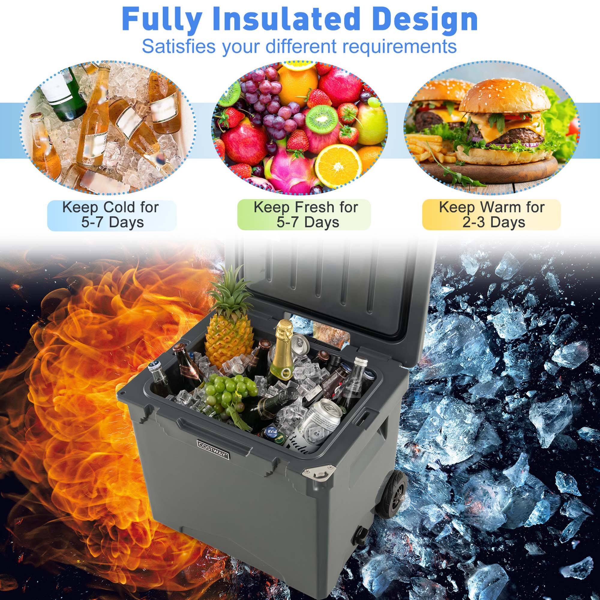 Love the sturdyness and color. It's deep enough to take your drinks and food. Love that you can pull up the handle to conveniently pull the cooler for a tall person. It's great that it has a bottle opener attached and two cup holders on the lid.
