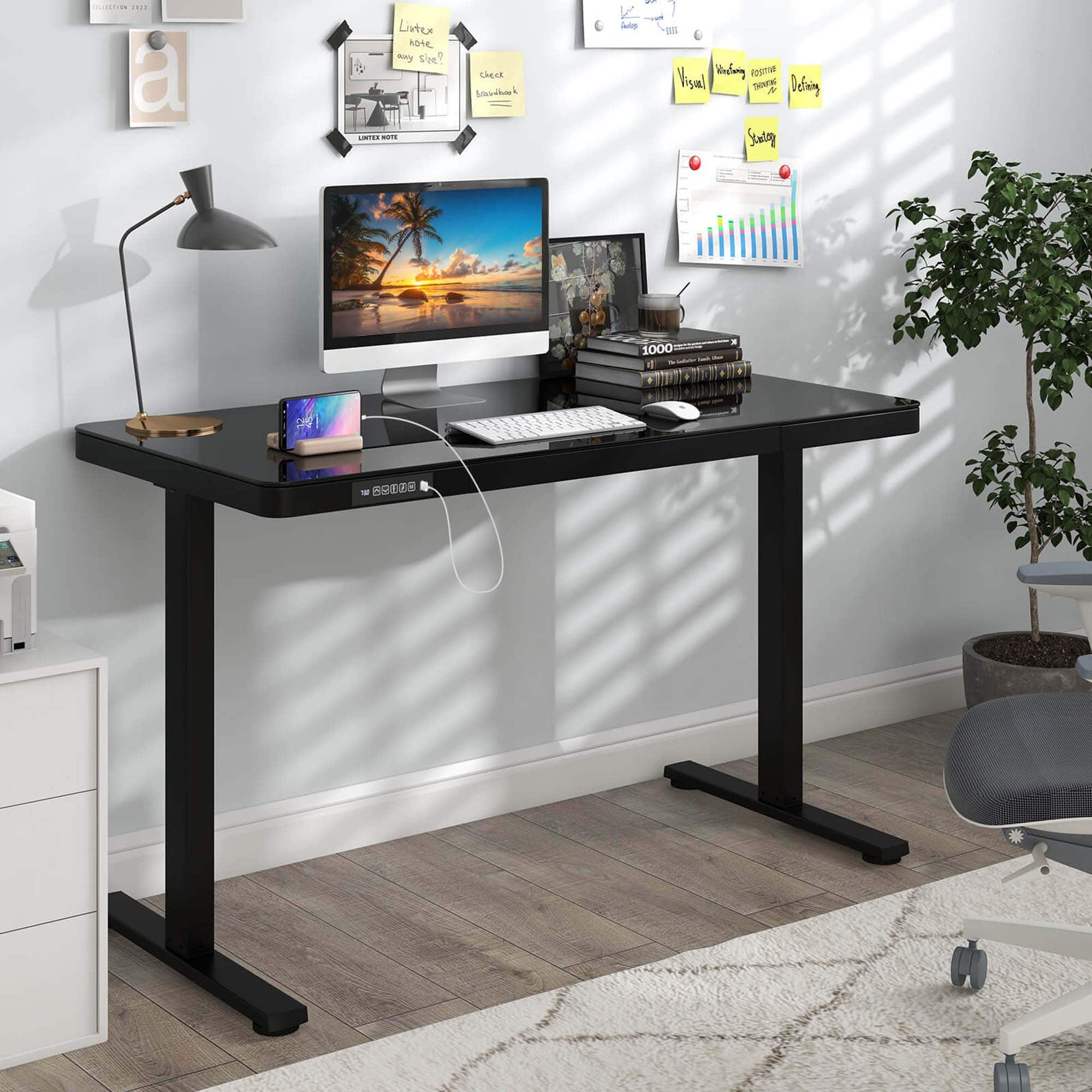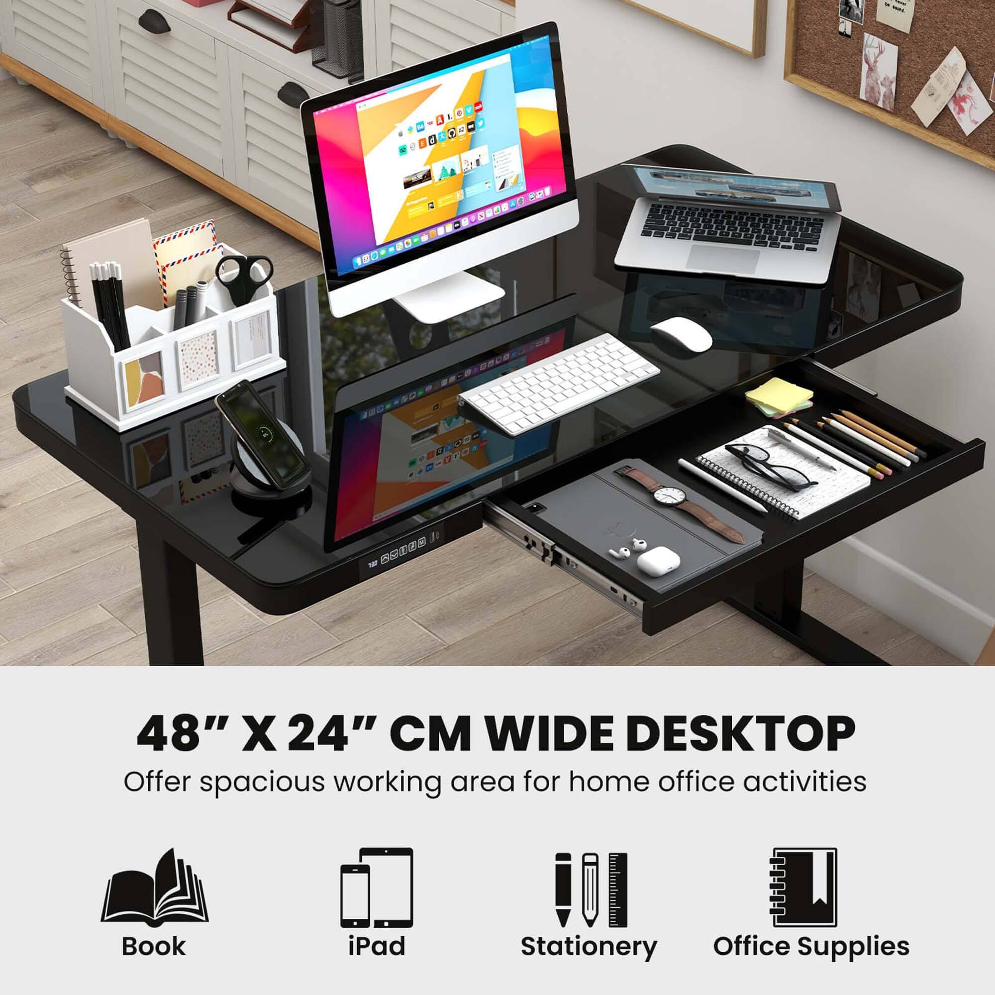 I did extensive research on standing desks and hate returning things, so choosing a desk without reviews was not very “on-brand” for me. I am SO happy I did, though! The desk did come in two separate shipments (one box for the frame and another for the tempered glass). Assembly was easily accomplished alone (40 year old semi in-shape lady).